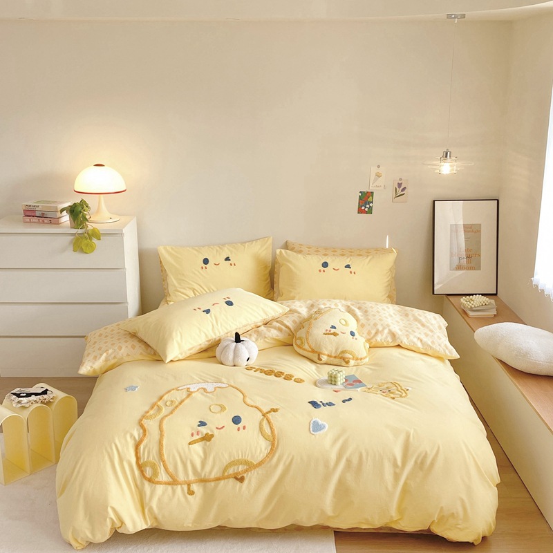 Size specification: 0.9m bed sheet three-piece set [quilt cover 150 x200cm], 1.2m bed sheet three-piece set [quilt cover 150 x200cm], 1.5 m bed sheet four-piece set [quilt cover 200 x230cm]],1.8m bed sheet four-piece set [quilt cover 200 x230cm], 1.5 m bed sheet four-piece set [quilt cover 200 x230cm],1.8m bed sheet four-piece set [quilt cover 200 x230cm], pillow 40x43cm [naughty cheese] only