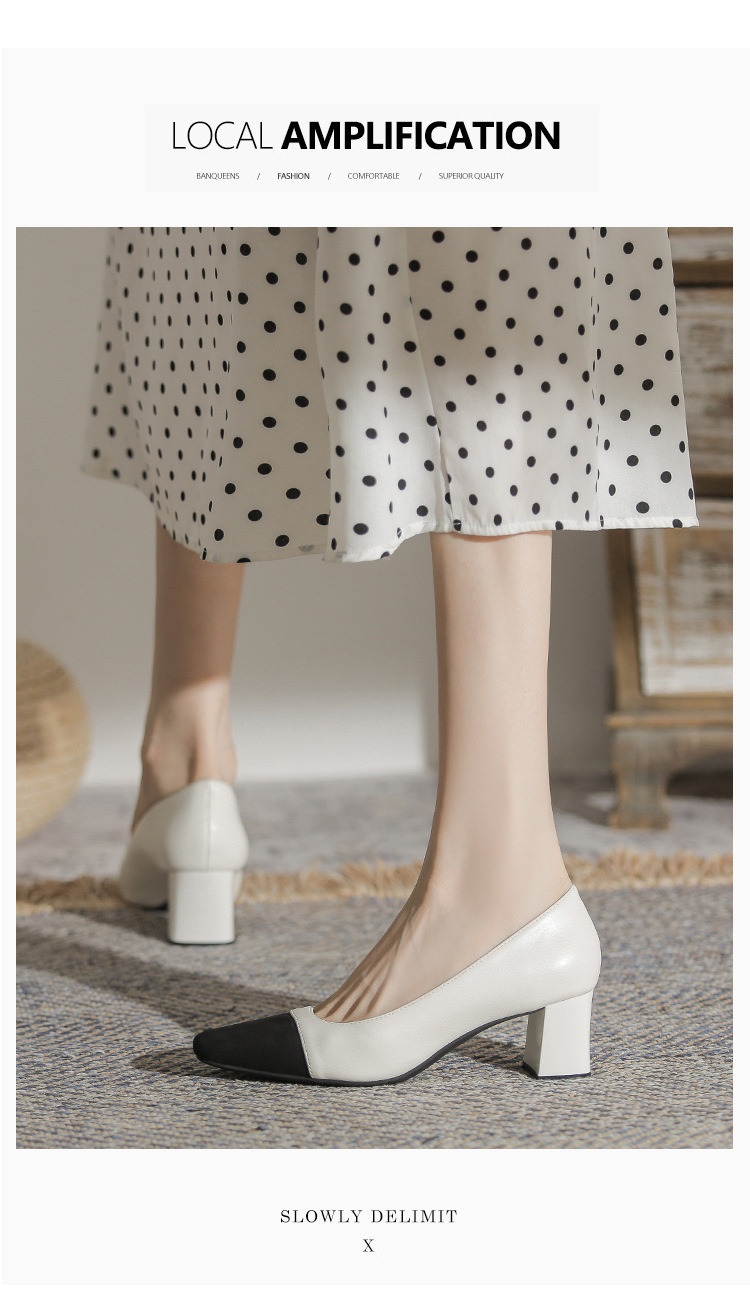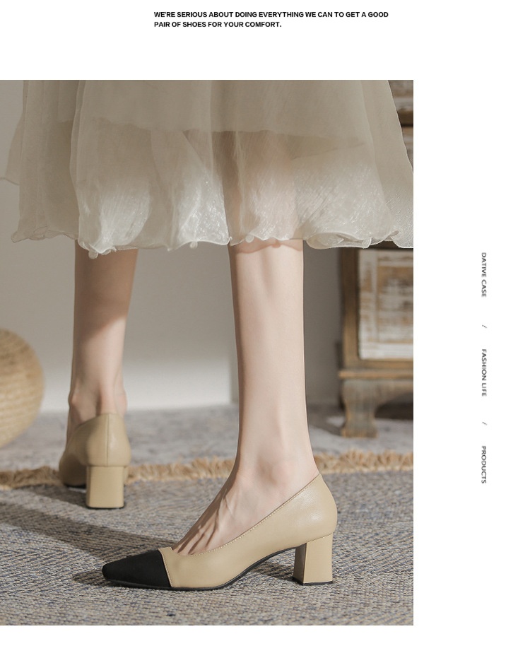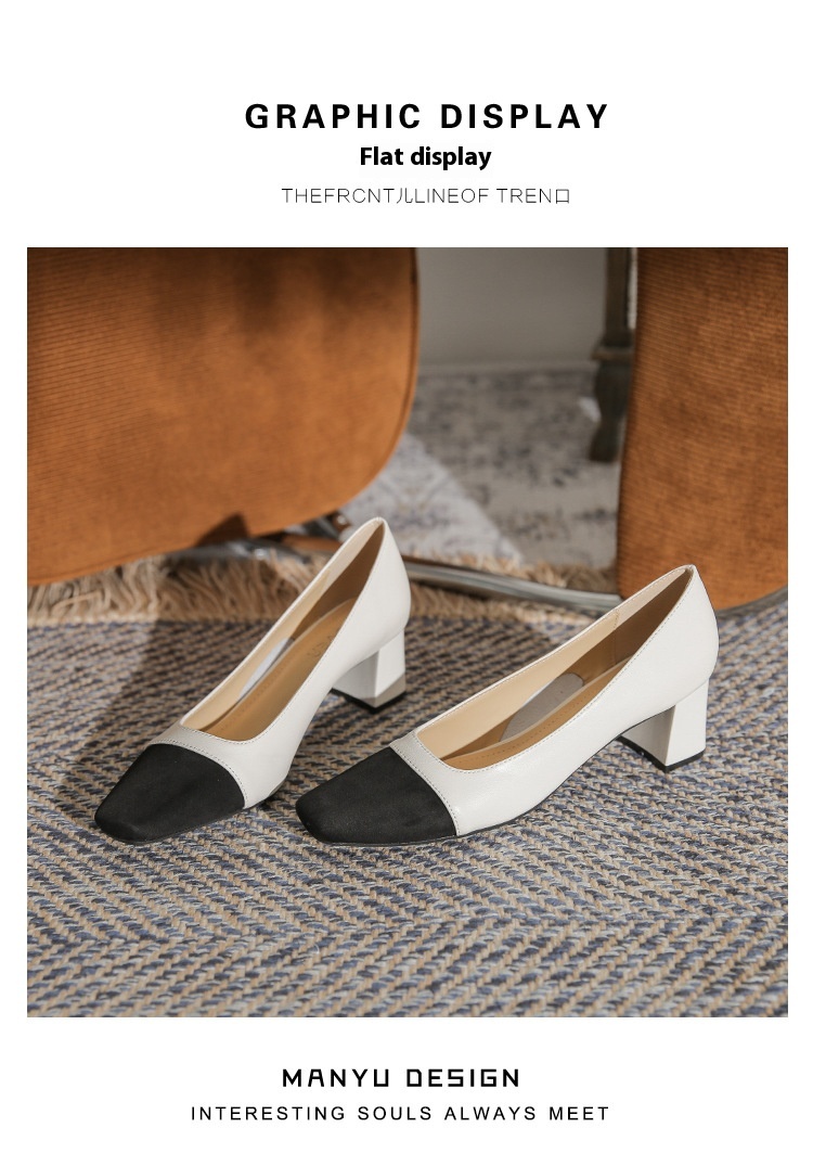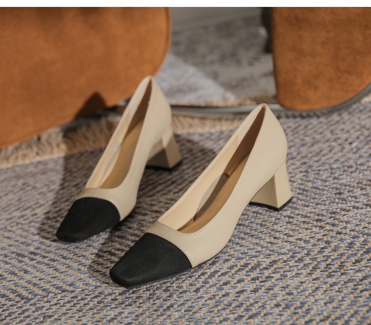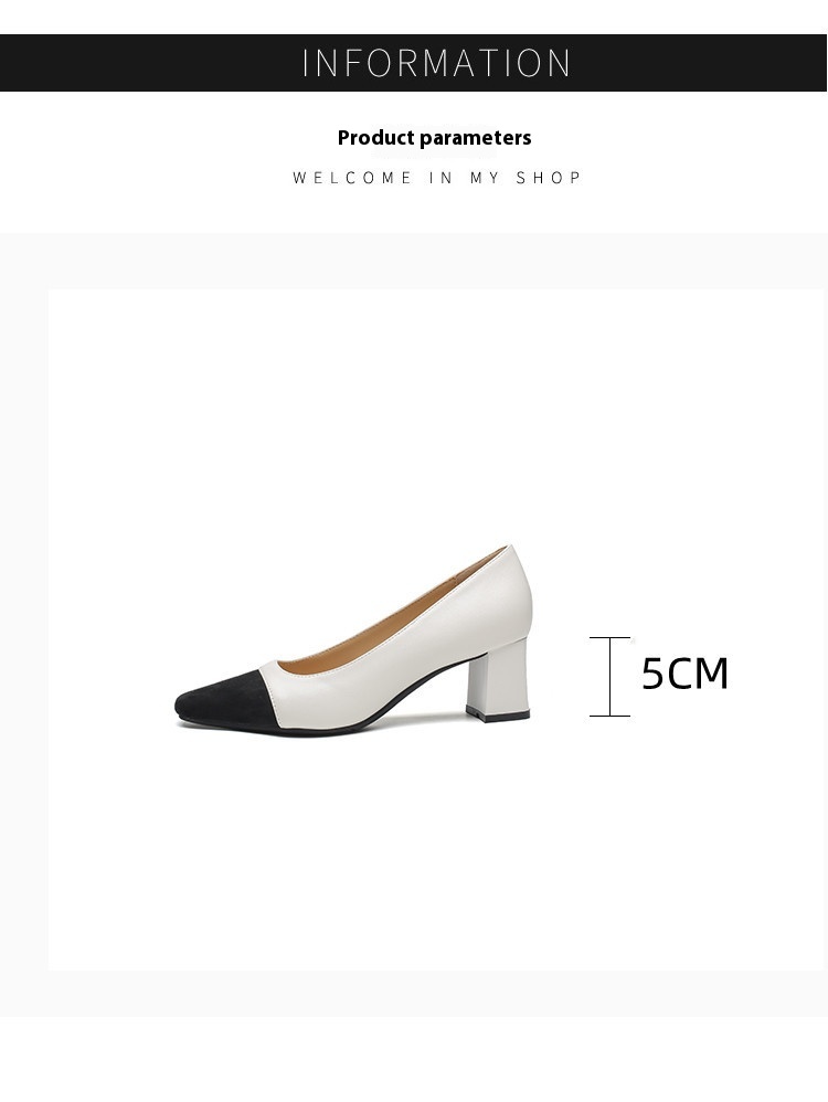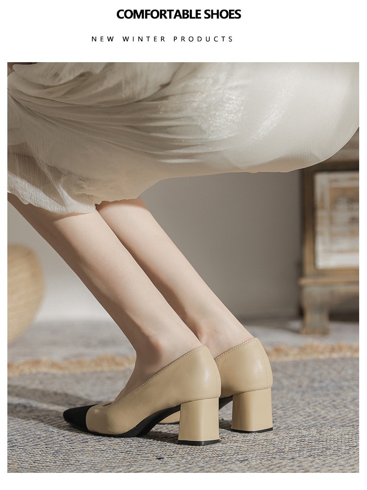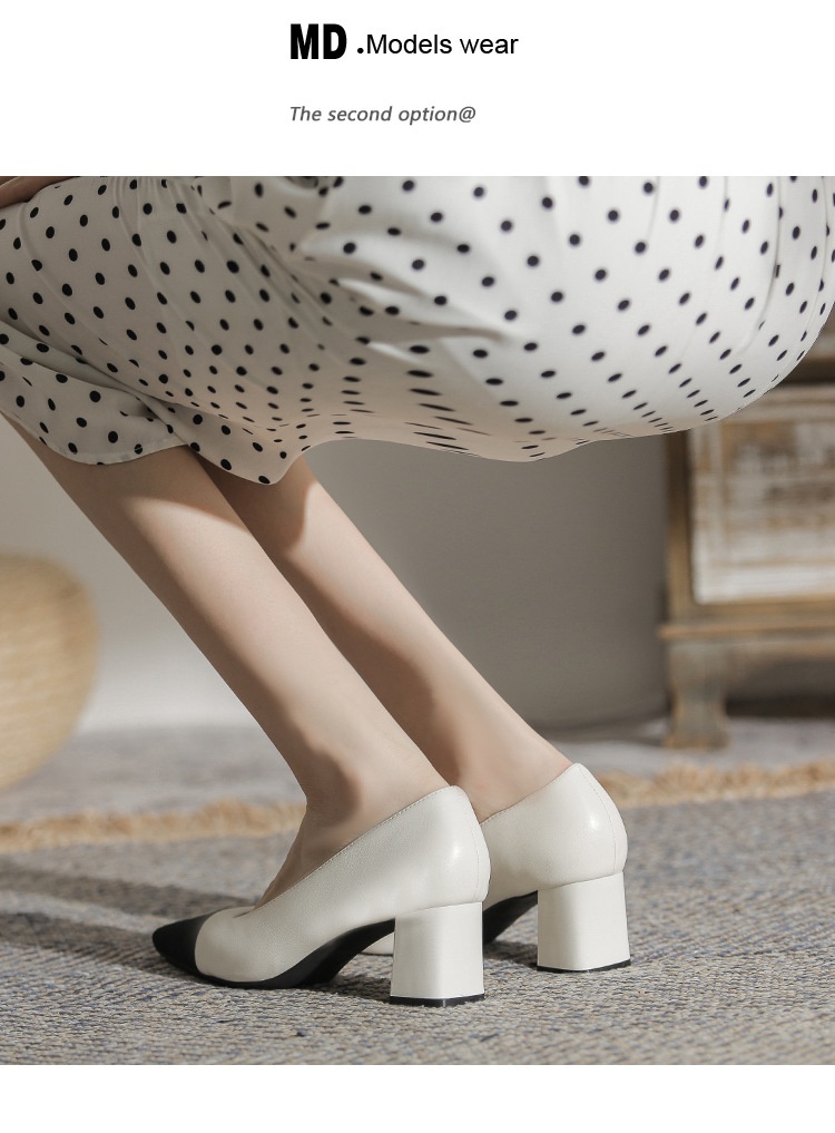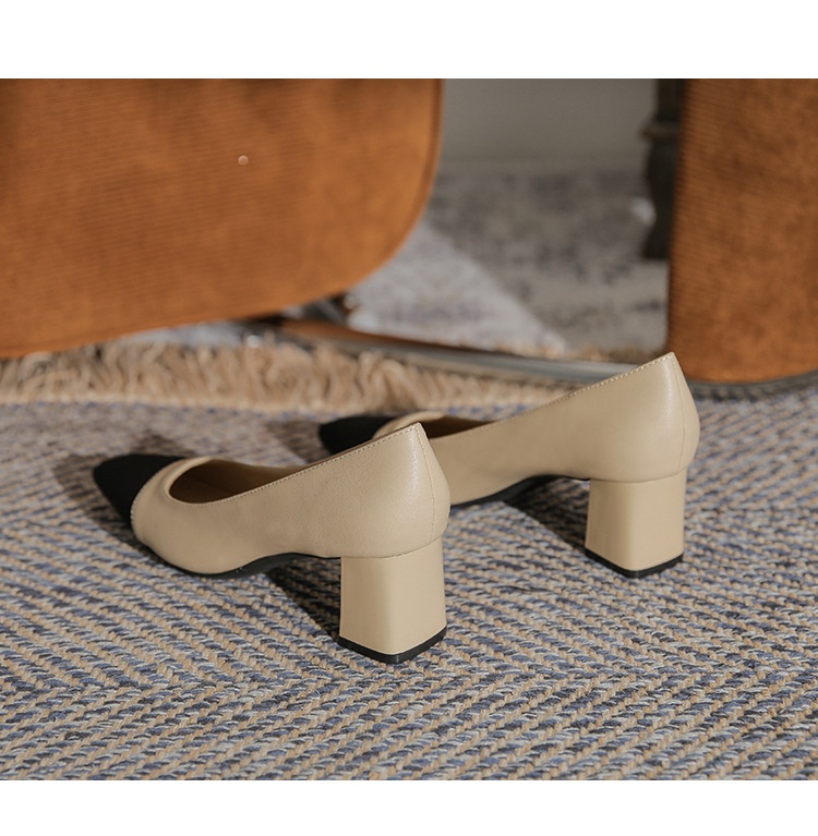 Classic Style Chunky Genuine Leather Pumps Temperament Color Matching Low-cut Mid Heel High Heels