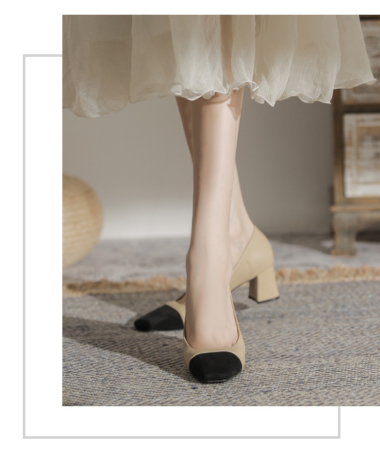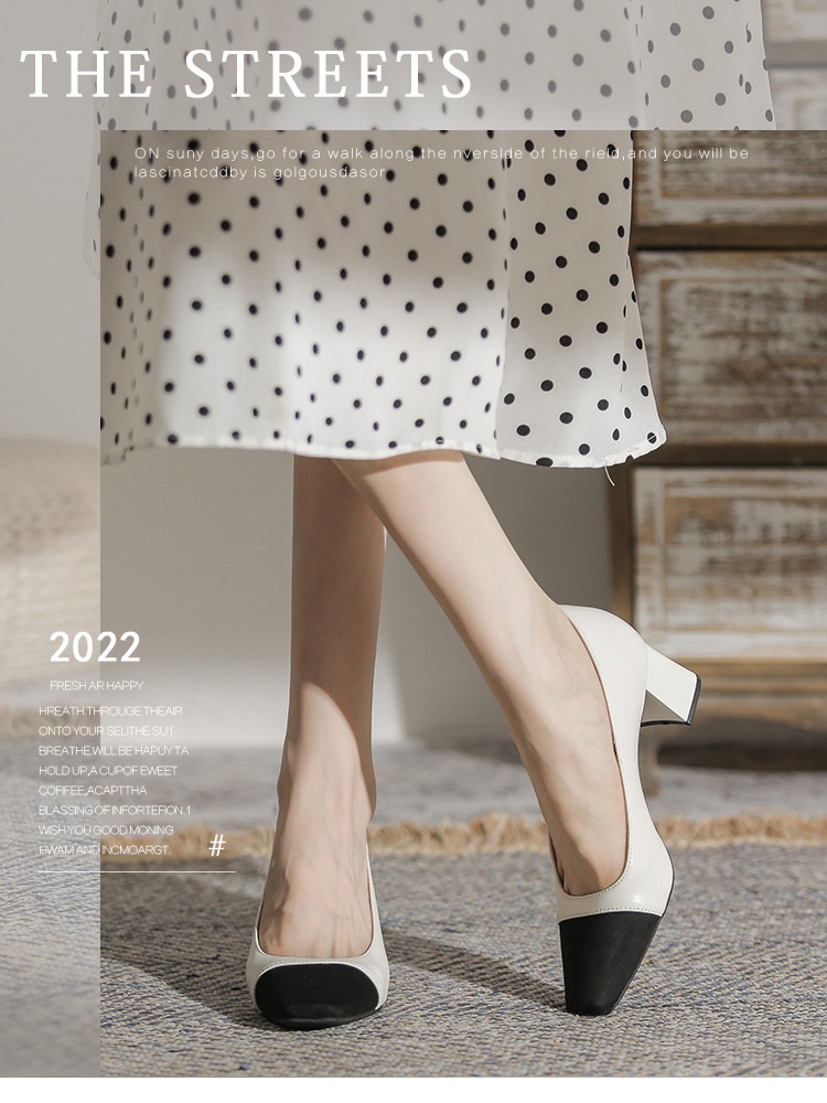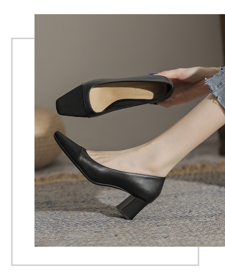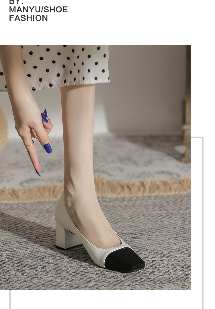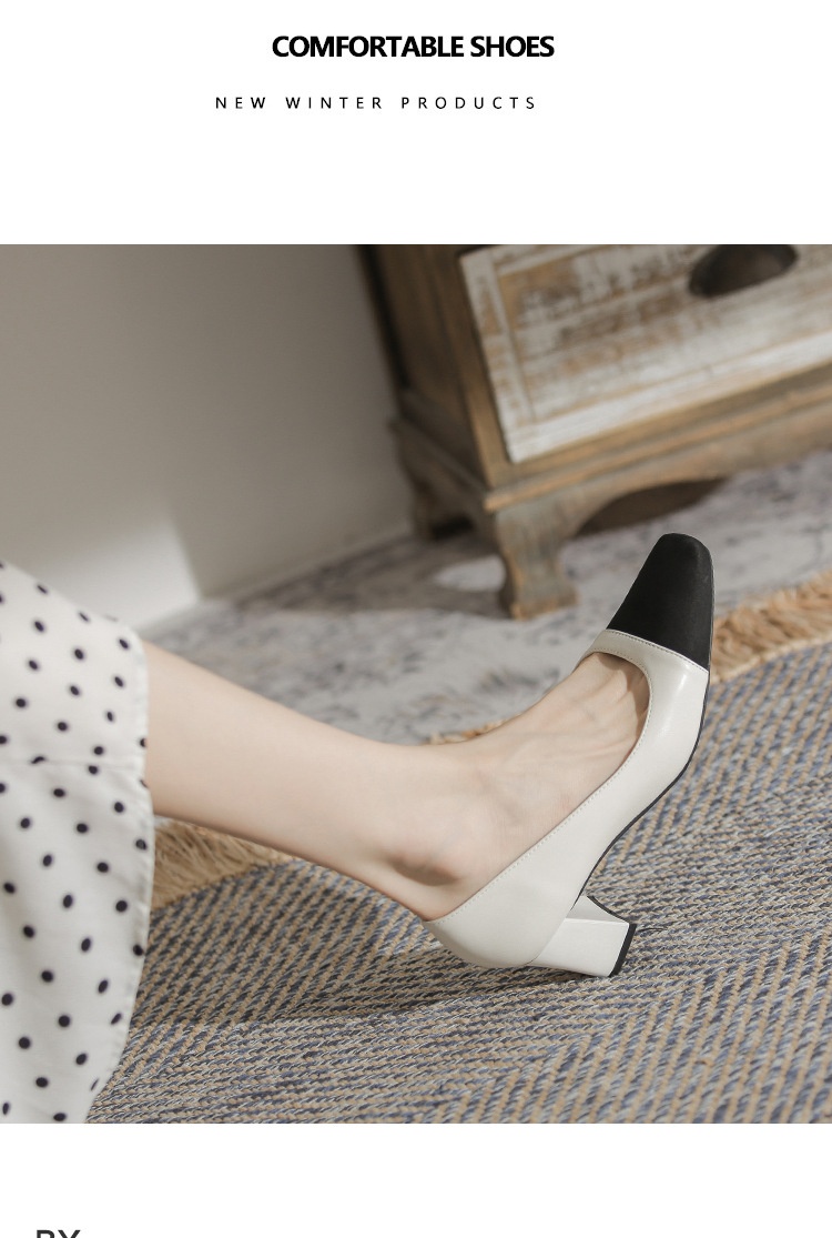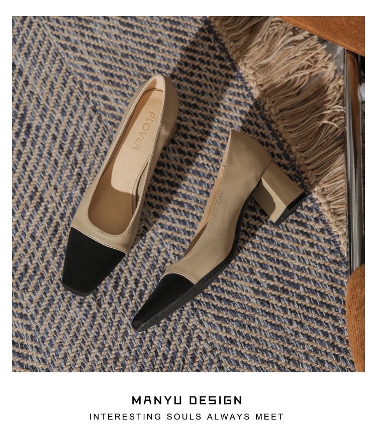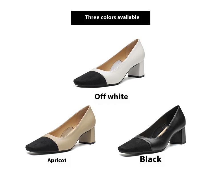 Classic Style Chunky Genuine Leather Pumps Temperament Color Matching Low-cut Mid Heel High Heels