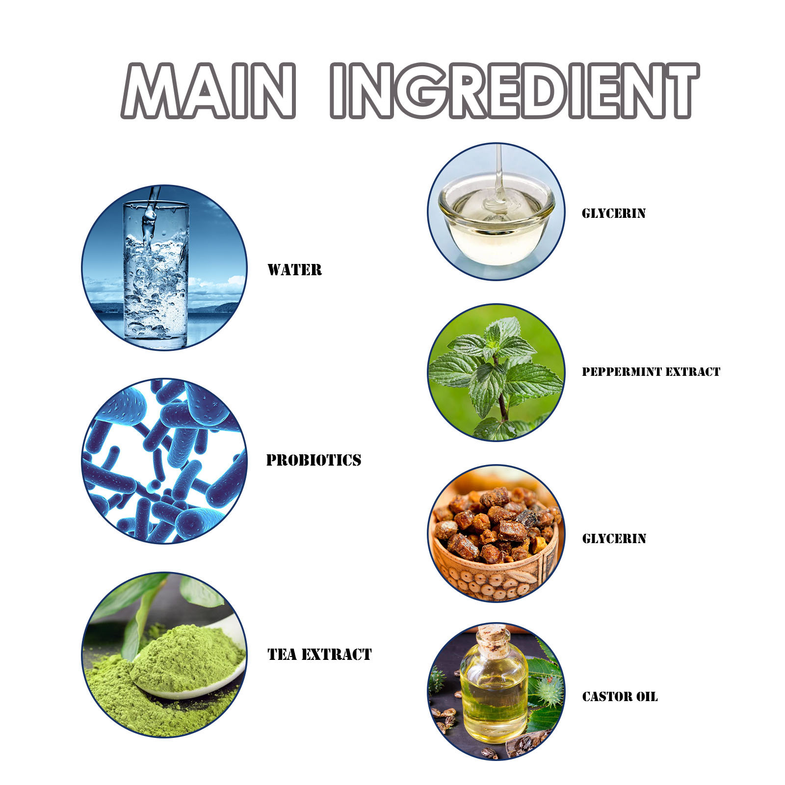 Ingredients: water, probiotics, tea extract, mint extract, propolis, castor oil, glycerin