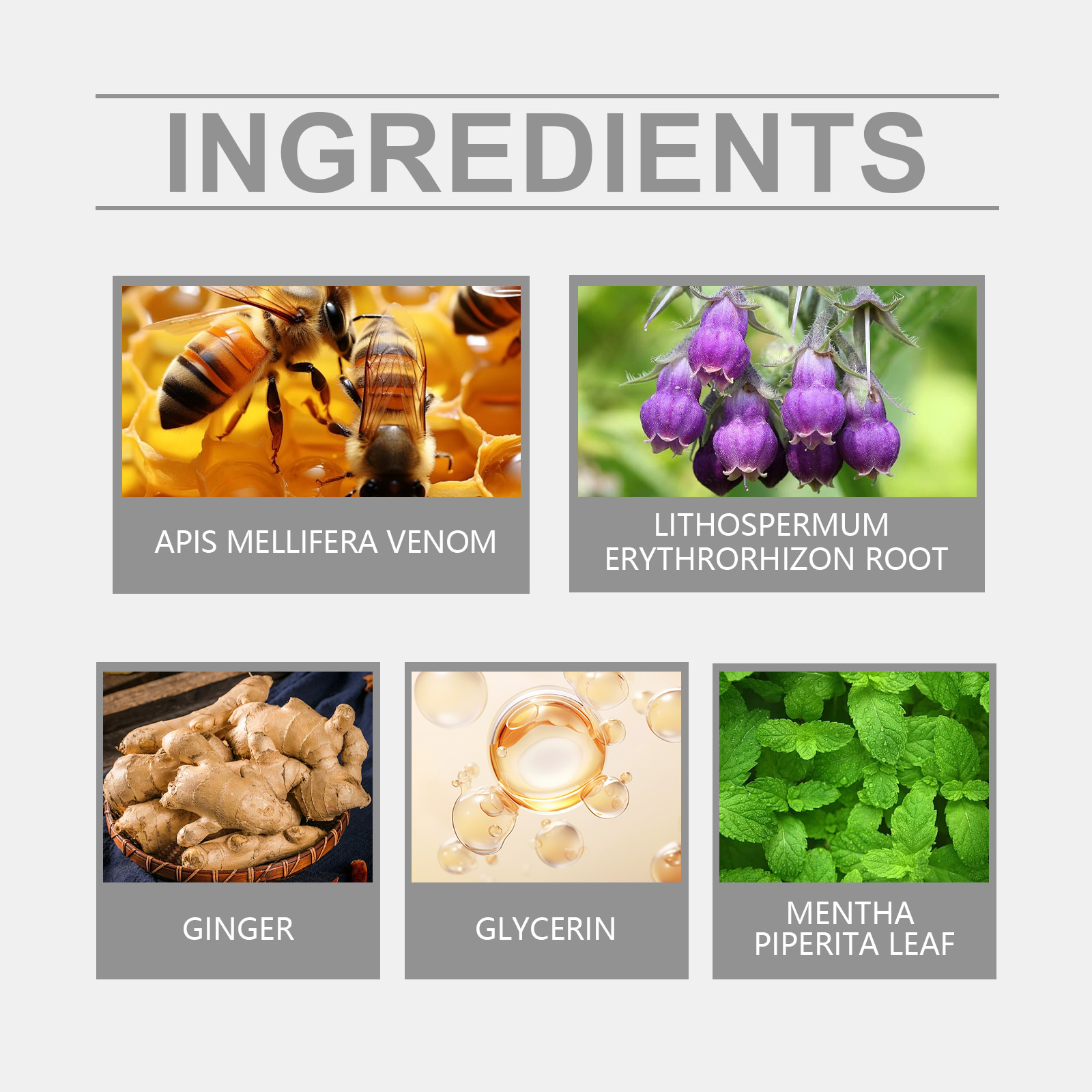 Product Ingredients: active ingredients: bee venom, alkanet, mint leaf, Ginger