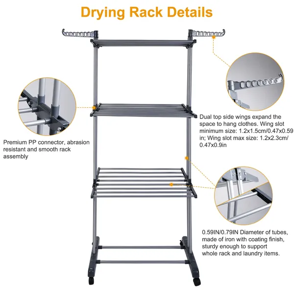 ** 3-Tier Clothes Rack*:With 3 tiers,bottom shoe rack and 2 side wings,you can hang your clothes with a nice amount of space between them so they can dry thoroughly. **88LBS Max Load*:Made of PP and iron pipe coating materials,support 88lbs max load. **Sliding Rack*:4 rotating wheels on the base,make easy to move it from one room to another room,inside or outside use. **DIY Assemble*:The number of brackets can be designed by yourself to prevent clothes from being too high and meet different drying needs. **Wide Applications*:Ideal for indoor use for display clothes,socks,towel drying and airing,storing clothes in spare bedrooms & lofts.