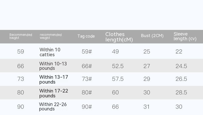 Suitable height: 59 (suitable for babies less than 10kg),66 (suitable for babies less than 5.00 kg-6.50kg),73 (suitable for babies less than kg-8. For babies less than 50kg),80 (suitable for babies less than 8.50kg-11.00kg),90 (suitable for babies less than 11.00kg-13.00kg)