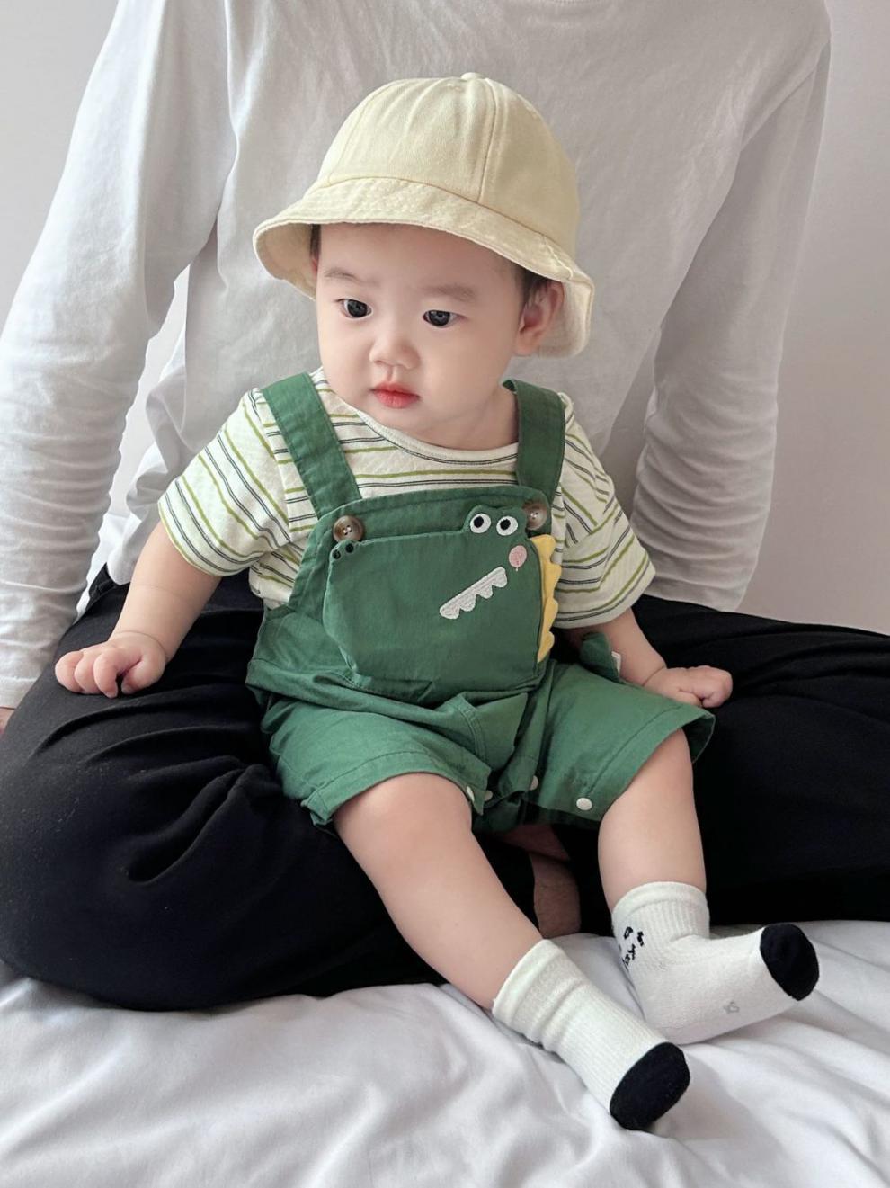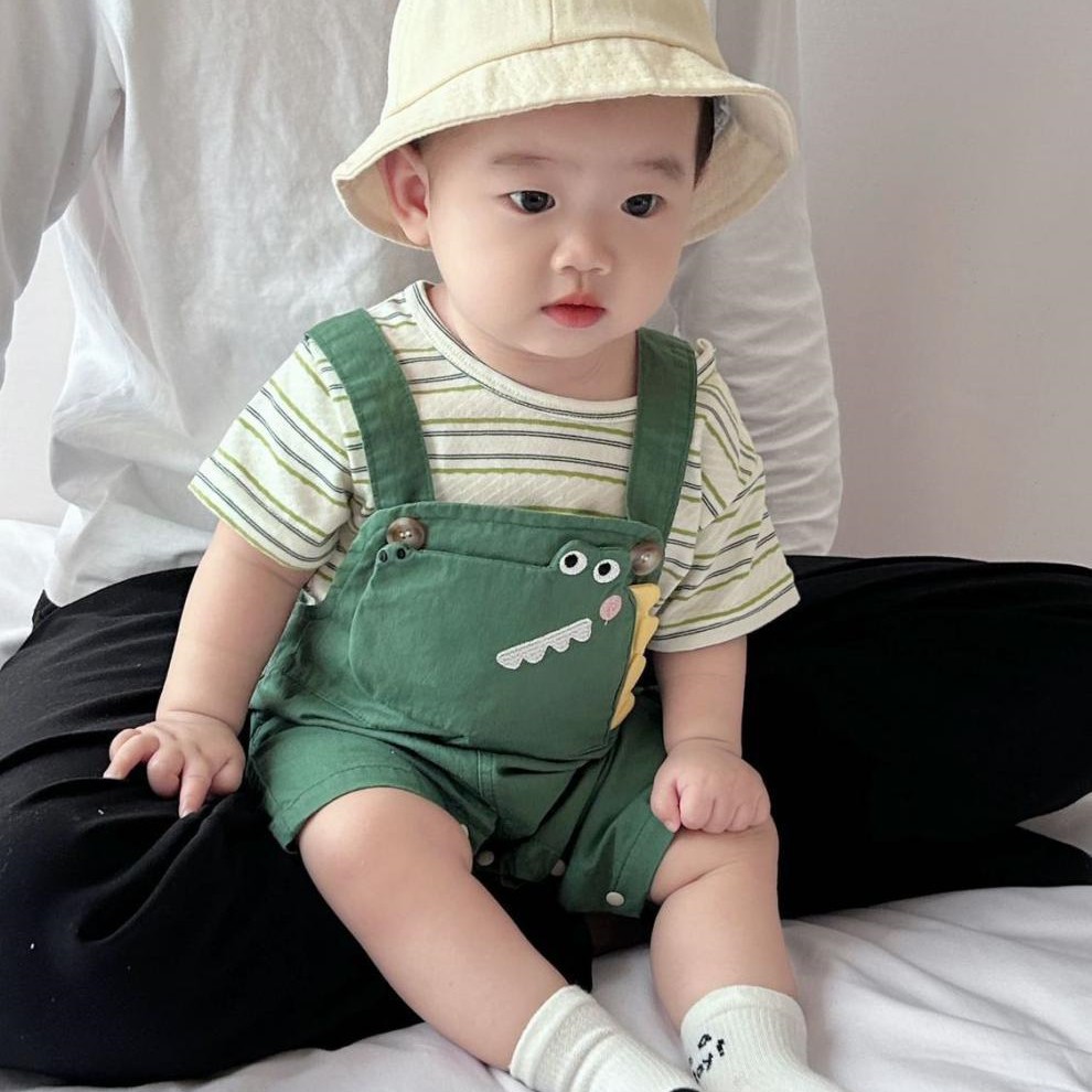 Color: dark green dinosaur fake suspenders half sleeve jumpsuit strap fixed