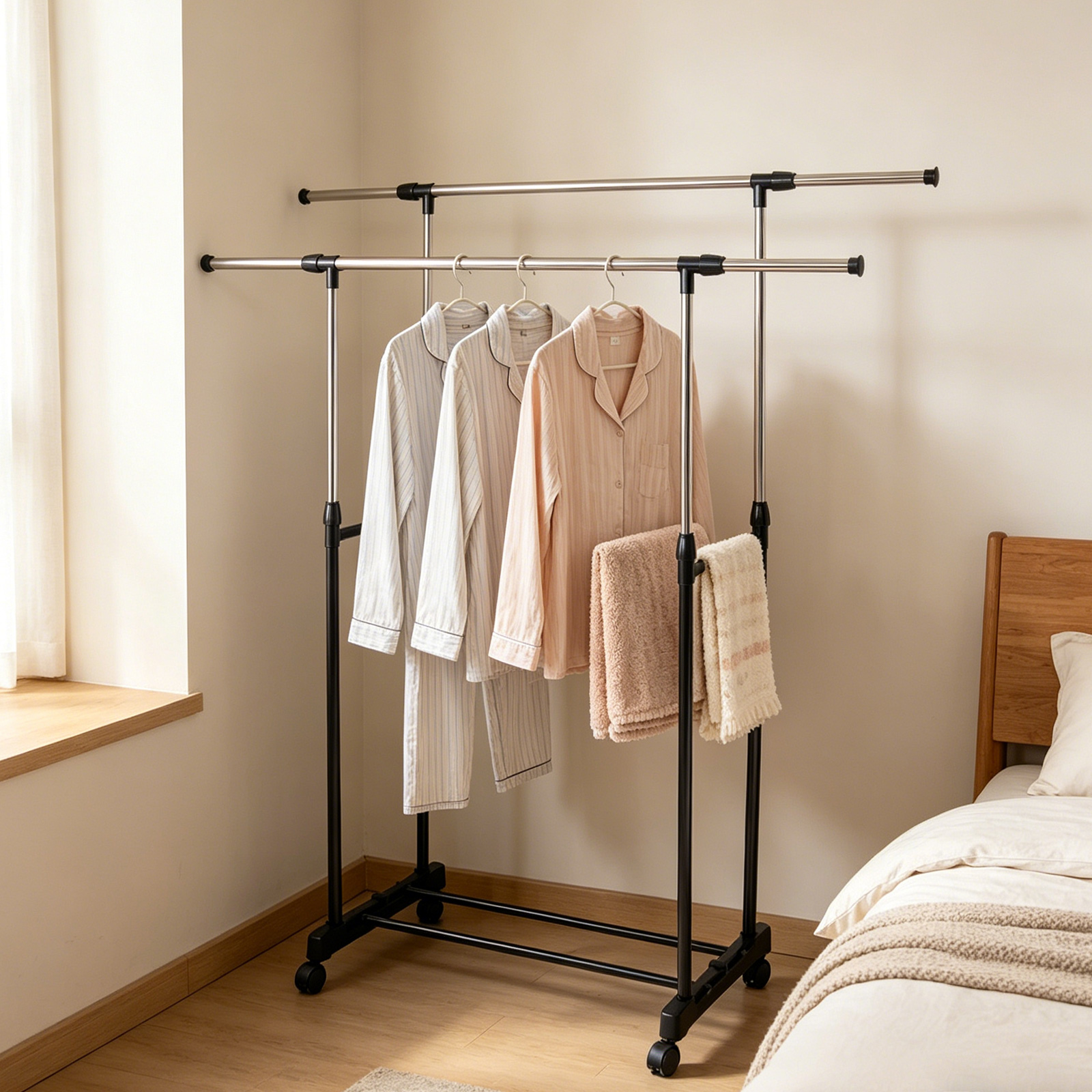 3. Designed into horizontal and vertical stretching for more clothes. You can easily retract it when not in use. Equipped with a shoe shelf for your convenient storage