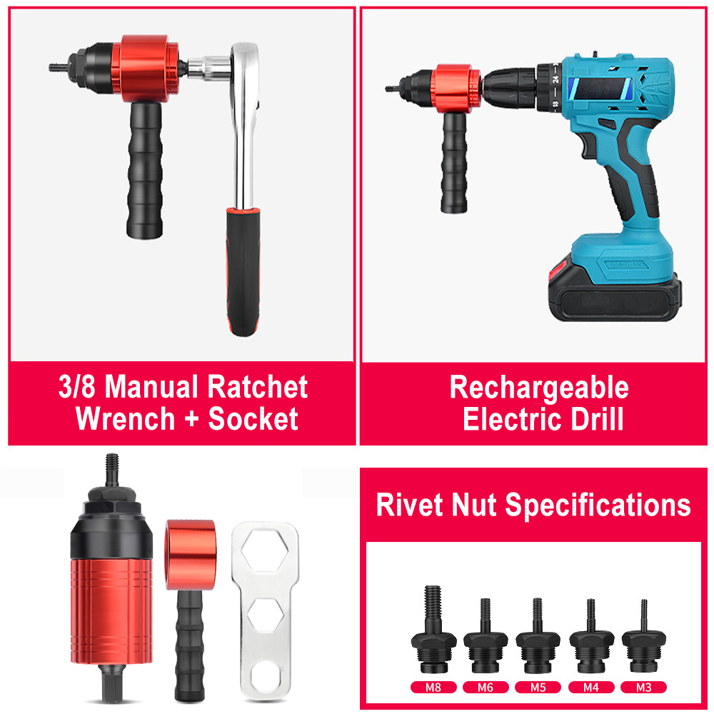Specifications: electric nut gun (with M3M4M5M6M8 head), electric nut gun + 1/2 sleeve + manual ratchet wrench