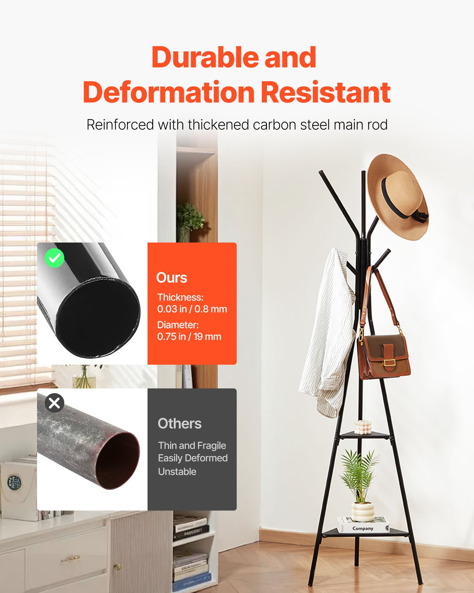 Strong Load Capacity: Create a tidier home space with VEVOR coat rack. It features a stable triangular structure, 6 hooks, 2 storage shelves, and a thickened carbon steel main rod. Each hook holds up to 6.6 lbs (3 kg), with a total capacity of 22 lbs (10 kg), providing stable support for hanging coats, hats, bags, and more