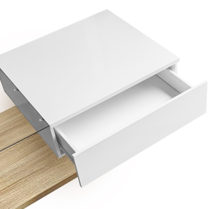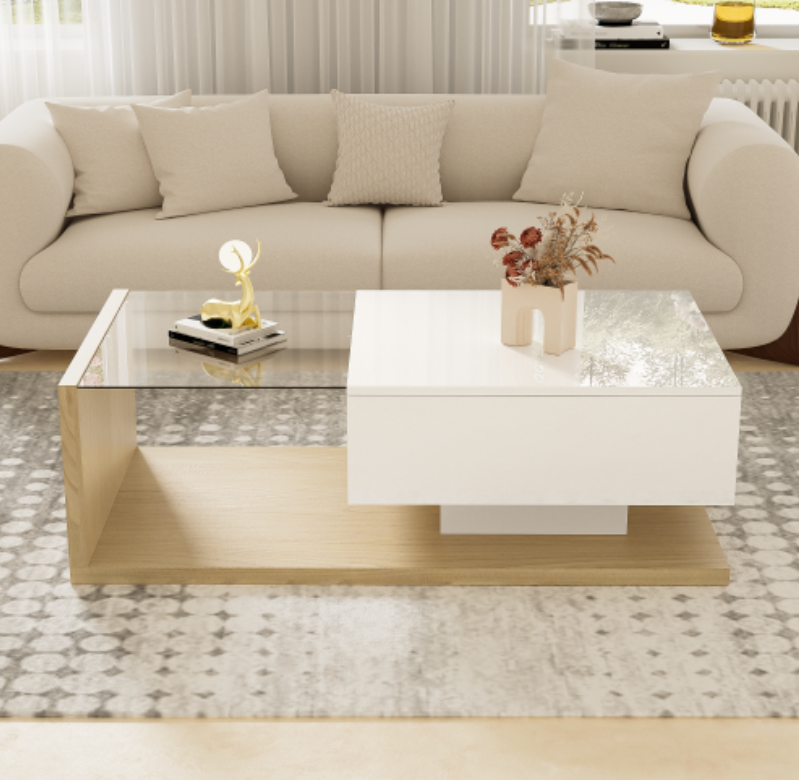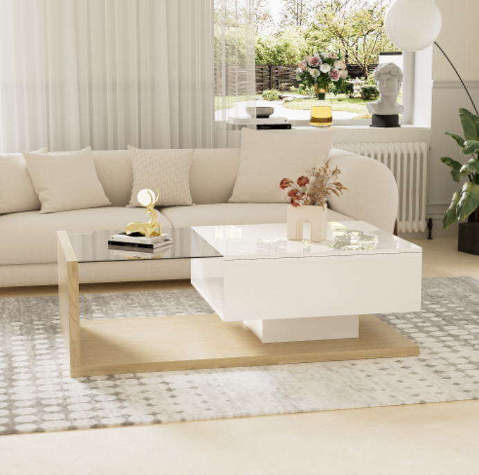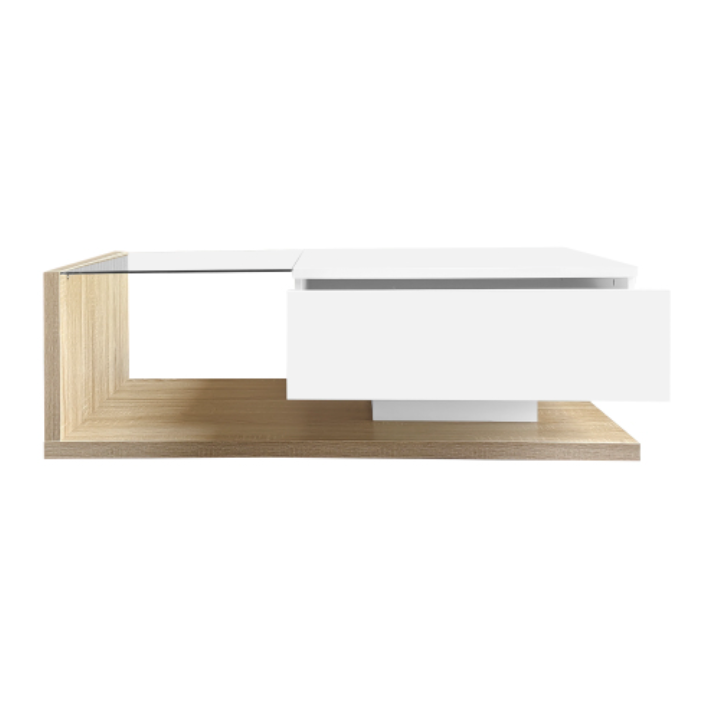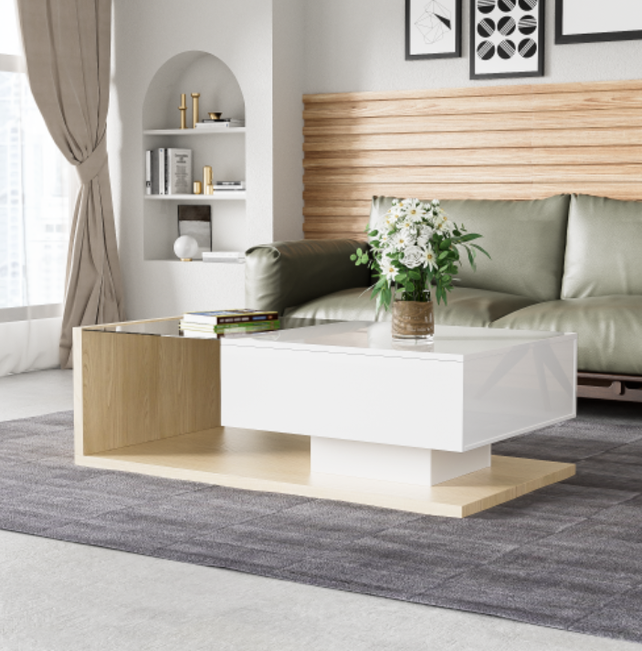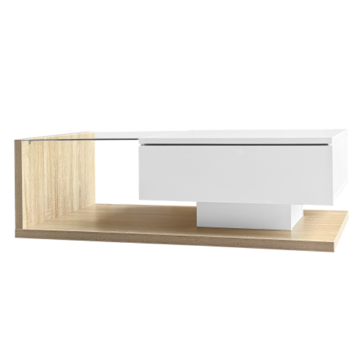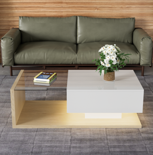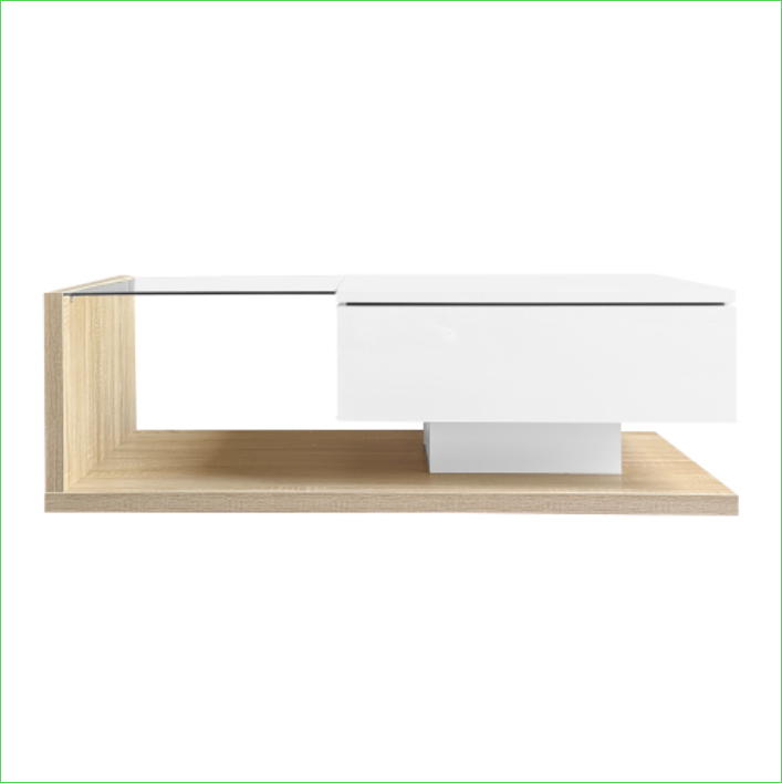 Product Name:Coffee table in high gloss white and wood color combination. Side tables, coffee tables with glass and LED