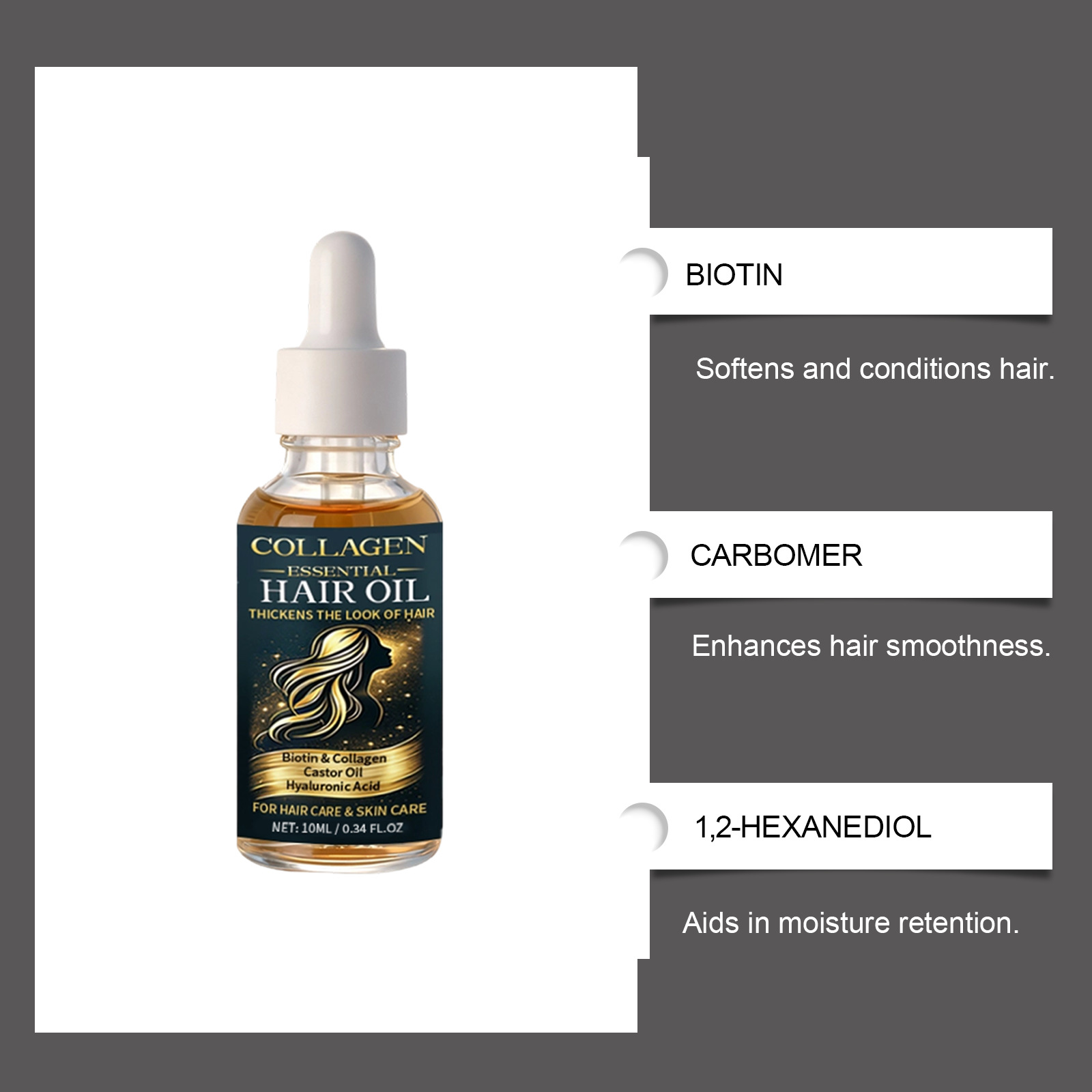 Ingredients: water, glycerin, 1,2- hexanediol, carbomer, arginine, biotin, hydrolyzed collagen, castor oil, hyaluronic acid, hydrolyzed keratin.