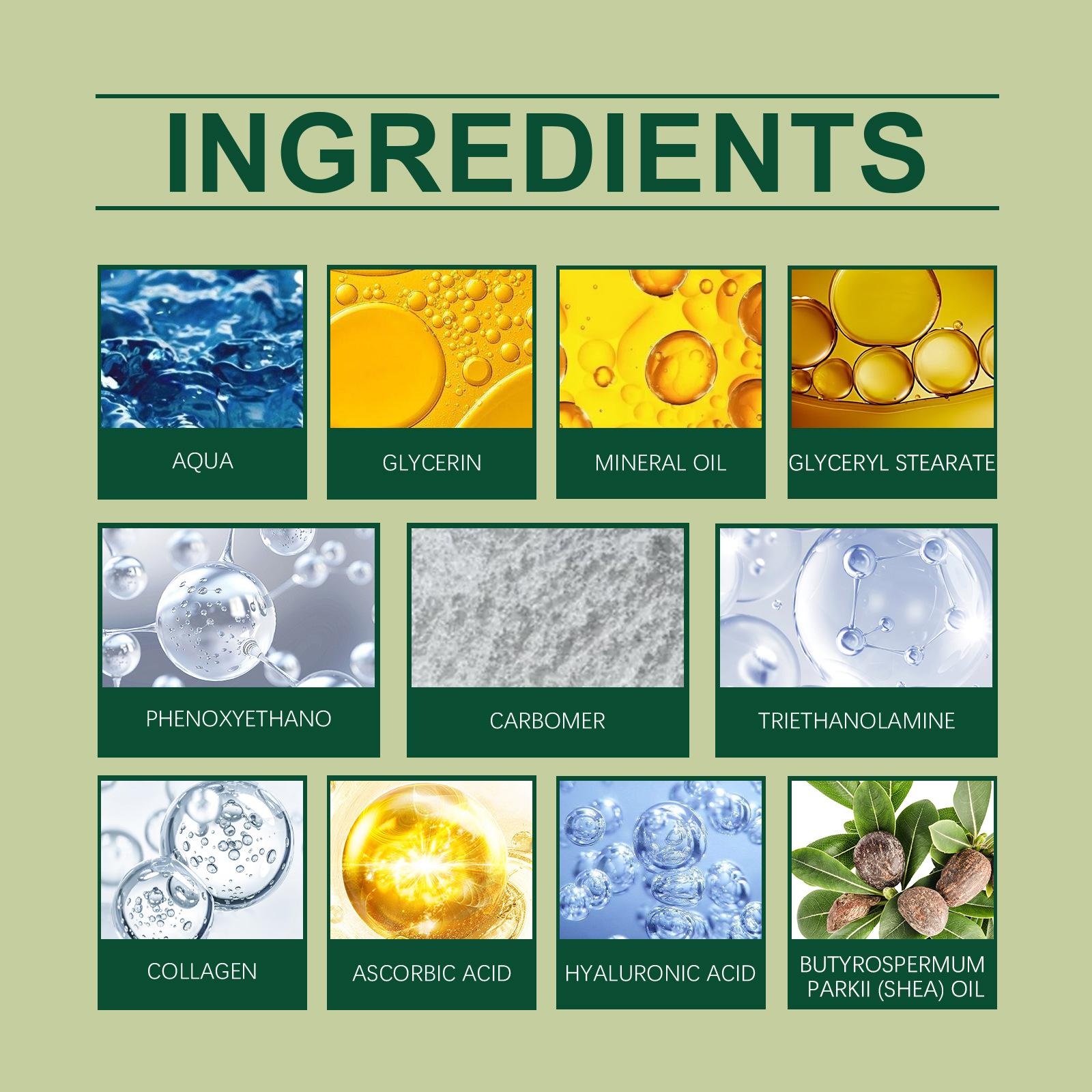 Ingredients: Water, glycerin, mineral oil, Glyceryl stearate, phenoxyethanol, carbomer, triethanolamine collagen, vitamin C, hyaluronic acid, shea butter