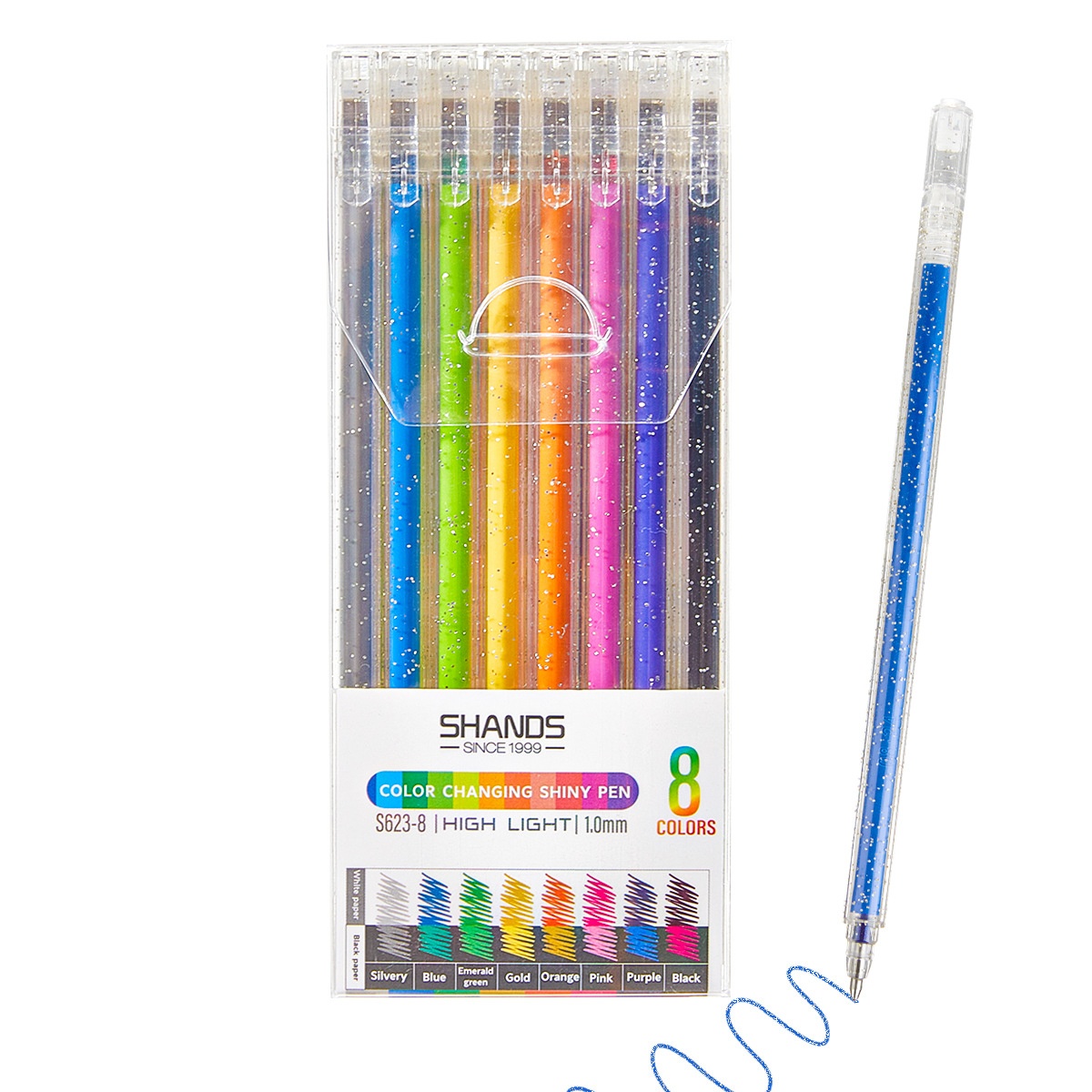 Shell material: plasticSpecification: 8 pcs/boxMain use: Office, stationeryModel: Shanzhi 623Pen body: 16cm mouthWriting: Shanzhi 623