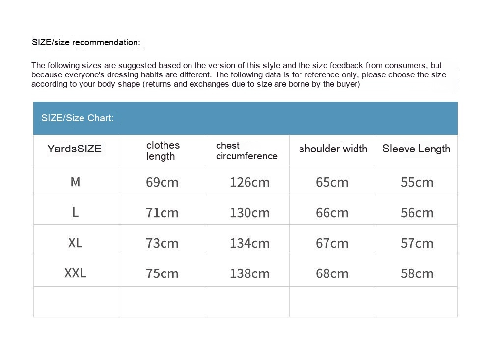 1. Asian sizes are 1 to 2 sizes smaller than European and American people. Choose the larger size if your size between two sizes. Please allow 2-3cm differences due to manual measurement. 2. Please check the size chart carefully before you buy the item, if you don't know how to choose size, please contact our customer service. 3.As you know, the different computers display colors differently, the color of the actual item may vary slightly from the following images.