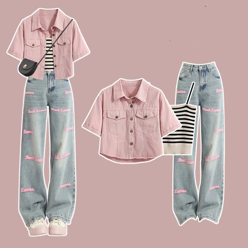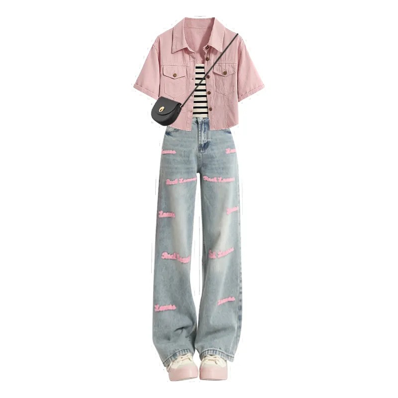 Color: M682# pink coat, M682# striped spaghetti straps, M682# pink coat striped spaghetti straps, 6700# pink letter embroidered jeans, M682# pink coat striped spaghetti straps pink letter embroidered jeans