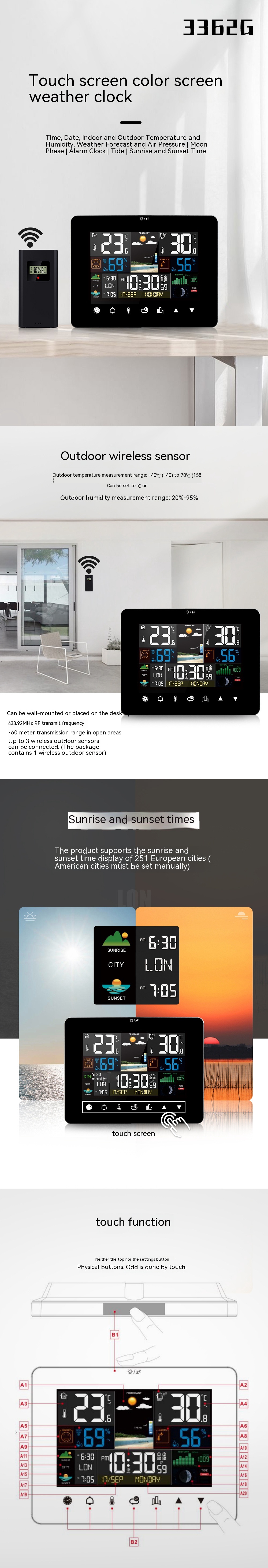 It can display the sunrise and sunset times of 251 mainstream European cities (manually set in US cities)