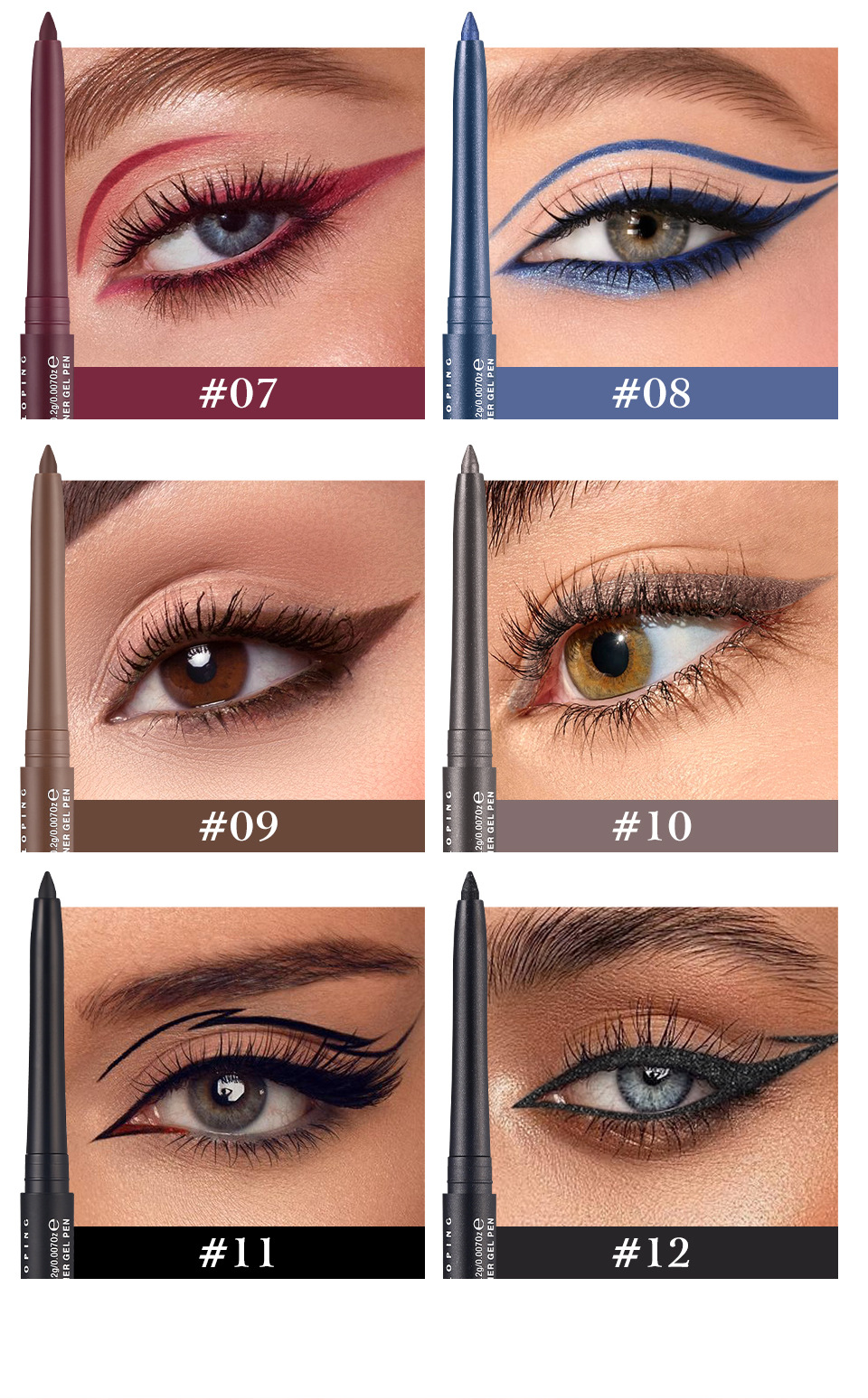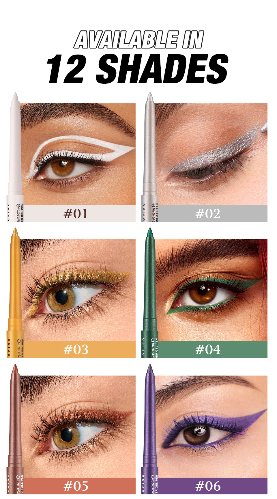 12 different colors eyeliner pen including matte & glitter & metallic & pearl effects eyeliner, and super pigmented formula can be quickly colored. A variety of fashionable colors can meet your different makeup needs.