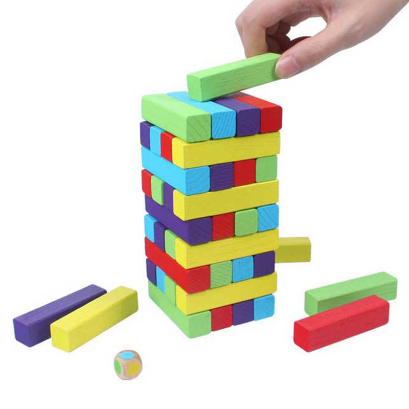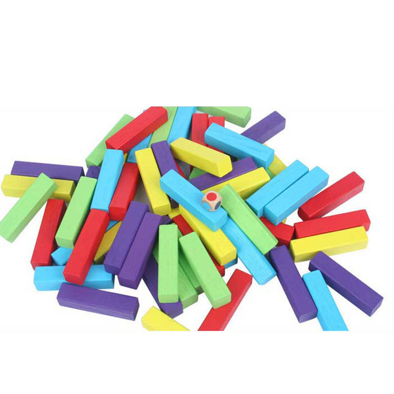 [Game method] Toss the dice to decide. Decide how many dice you take. The thrown color, addition, subtraction, multiplication, and division are determined by others (but must be decided before throwing). Which wooden block corresponds to the total color obtained, take that block out and pile it on top. Players take turns, whoever knocks down the pile of wooden blocks first loses. Exercise patience and balance control. After the draw is finished, stack up, and whoever allows the building to collapse is the loser. (Important: You must only use one hand).