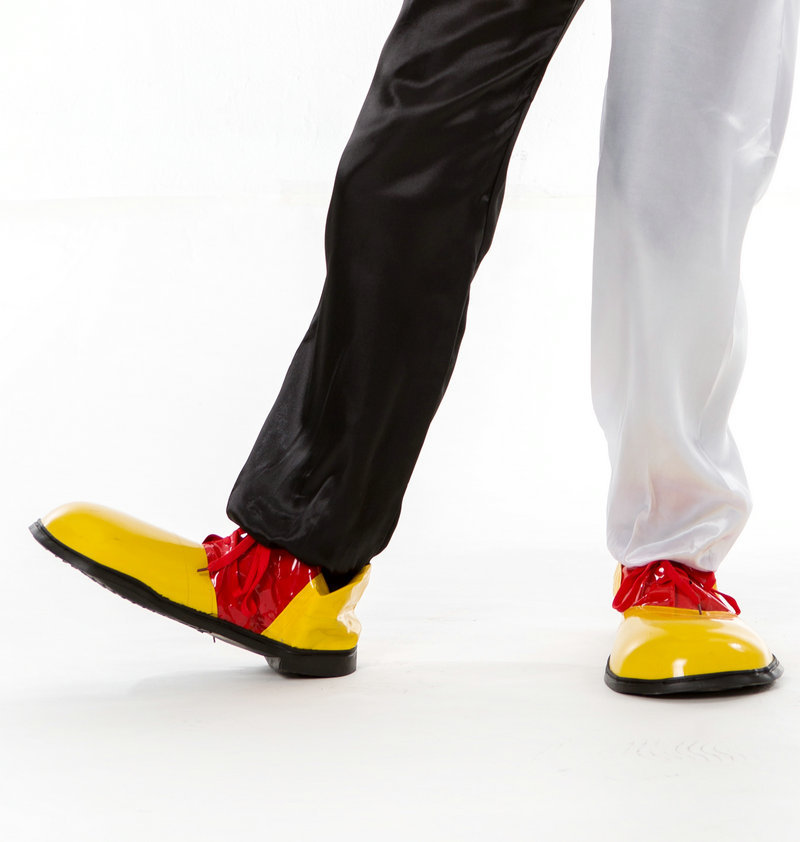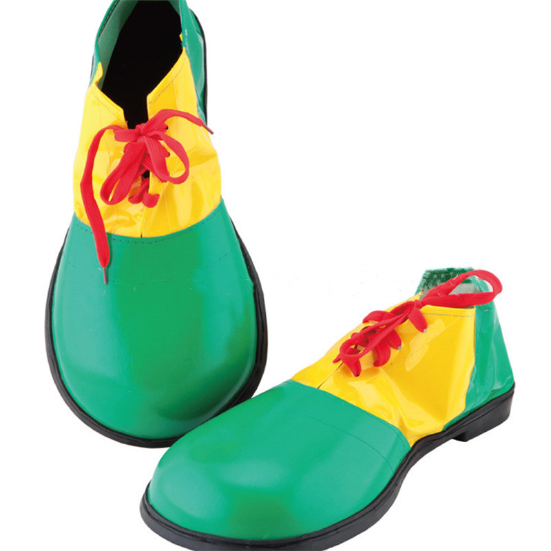 Color: green leather clown shoes,, red leather clown shoes