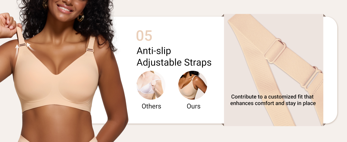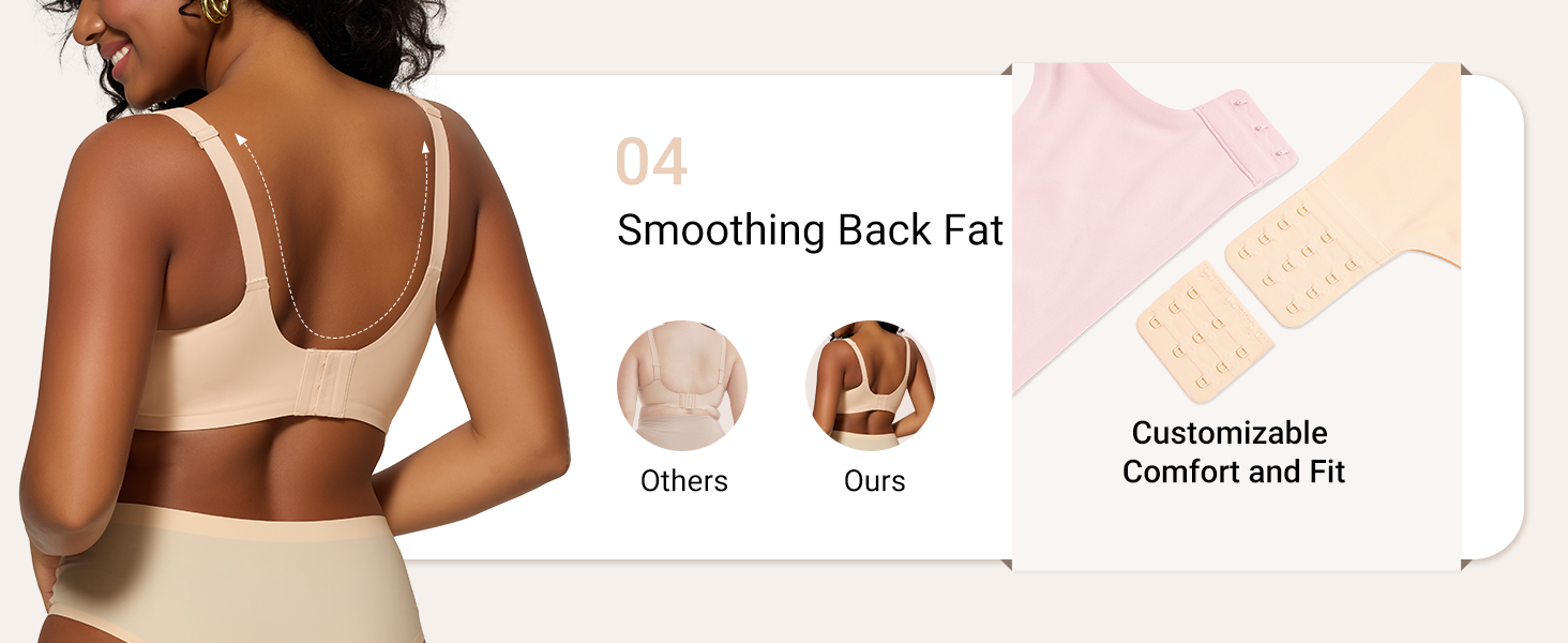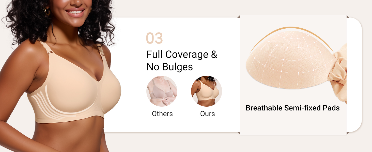 Front Adjustable Straps with Semi-Fixed Pads: These supportive bras for women come with front-adjustable, non-slip shoulder straps and a 4-row hook-and-eye extension buckle, allowing you to tweak the fit effortlessly for personalized comfort. The semi-fixed, contoured pads prevent shifting or bunching, while the full-coverage design wraps securely around your bust—delivering a sense of safety and reliable lift. It’s the perfect balance of gentle support and all-day comfort for women