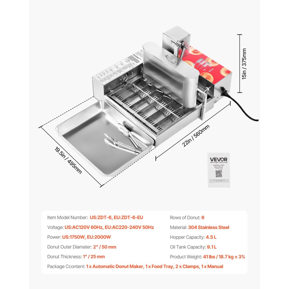 Food-Grade Stainless Steel: Constructed with 304 stainless steel, this frying donuts maker is easy to clean and maintain. Featuring a 4.5L hopper and a 9.1L oil tank, it's designed for high-volume production without constant refilling
