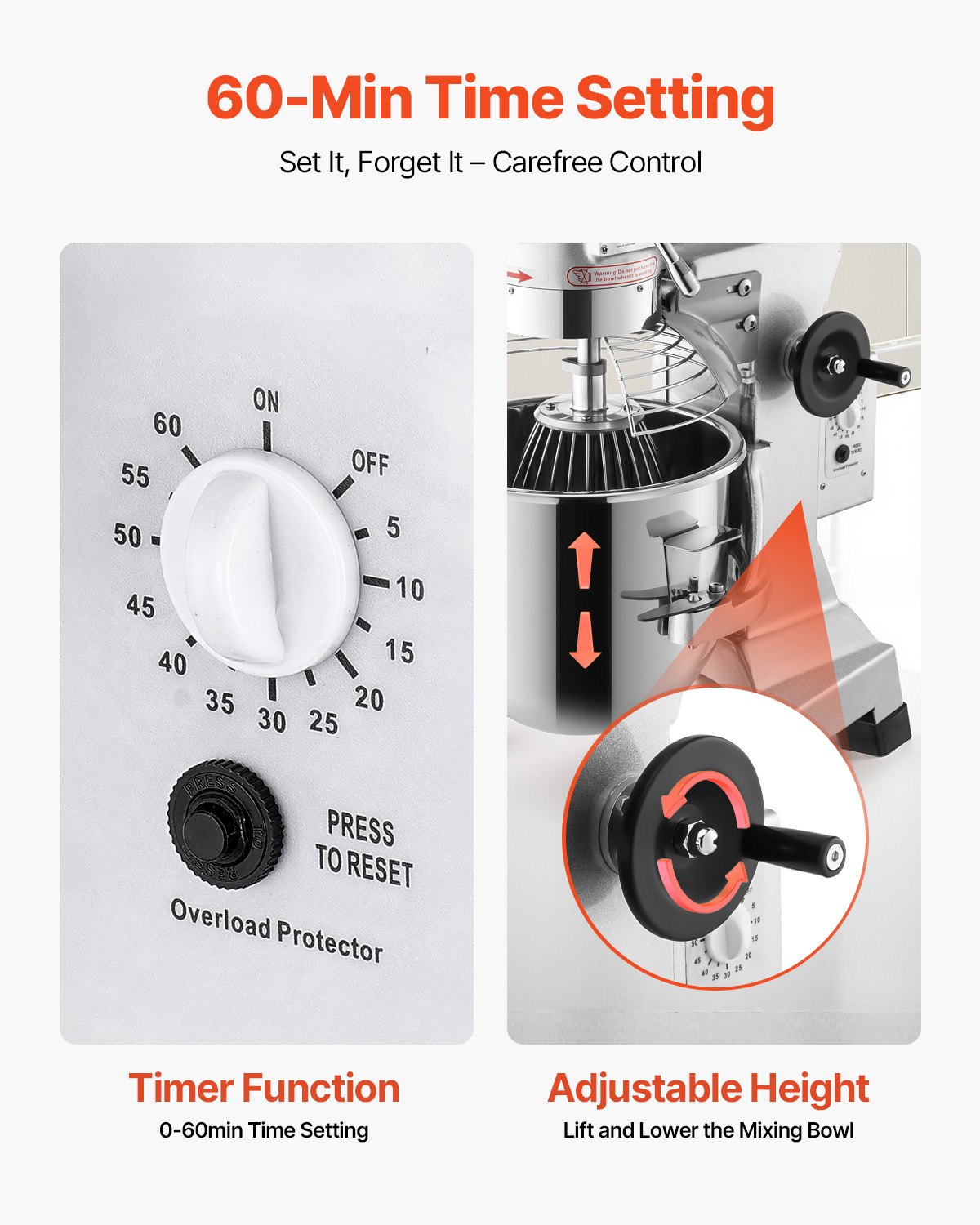 Protective Design: A stainless steel wire bowl guard is designed to keep large items from falling into the bowl during operation; The height of the bowl can be easily adjusted by a turning wheel; The START and STOP buttons operate independently, ensuring security.