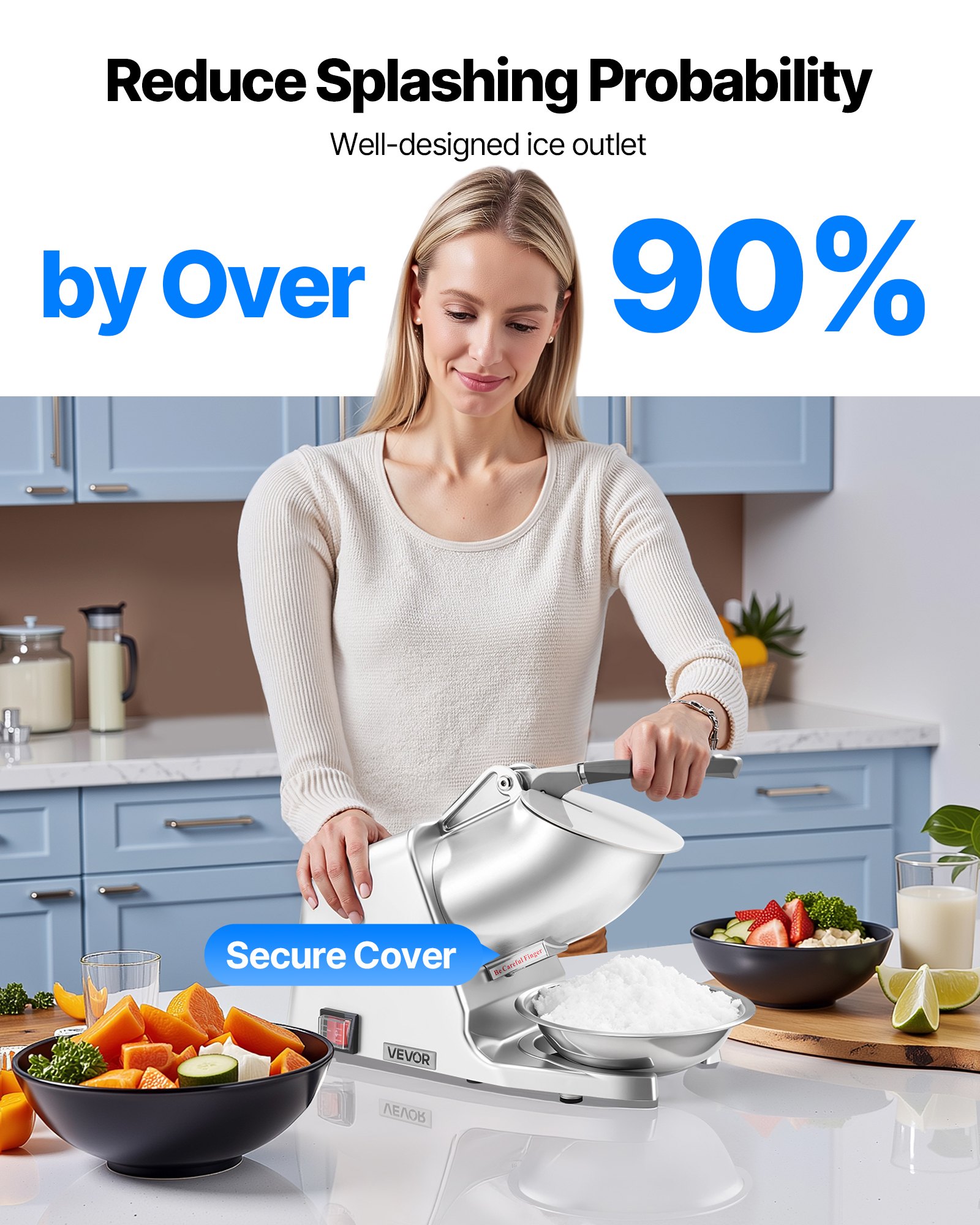High-Efficiency Ice Crushing: With a 300W motor and 2000 RPM, this ice crusher uses premium 4 stainless steel blades, achieving 286 lbs/h crushing capacity. It quickly turns ice cubes into fine snow, meeting all your ice-crushing needs