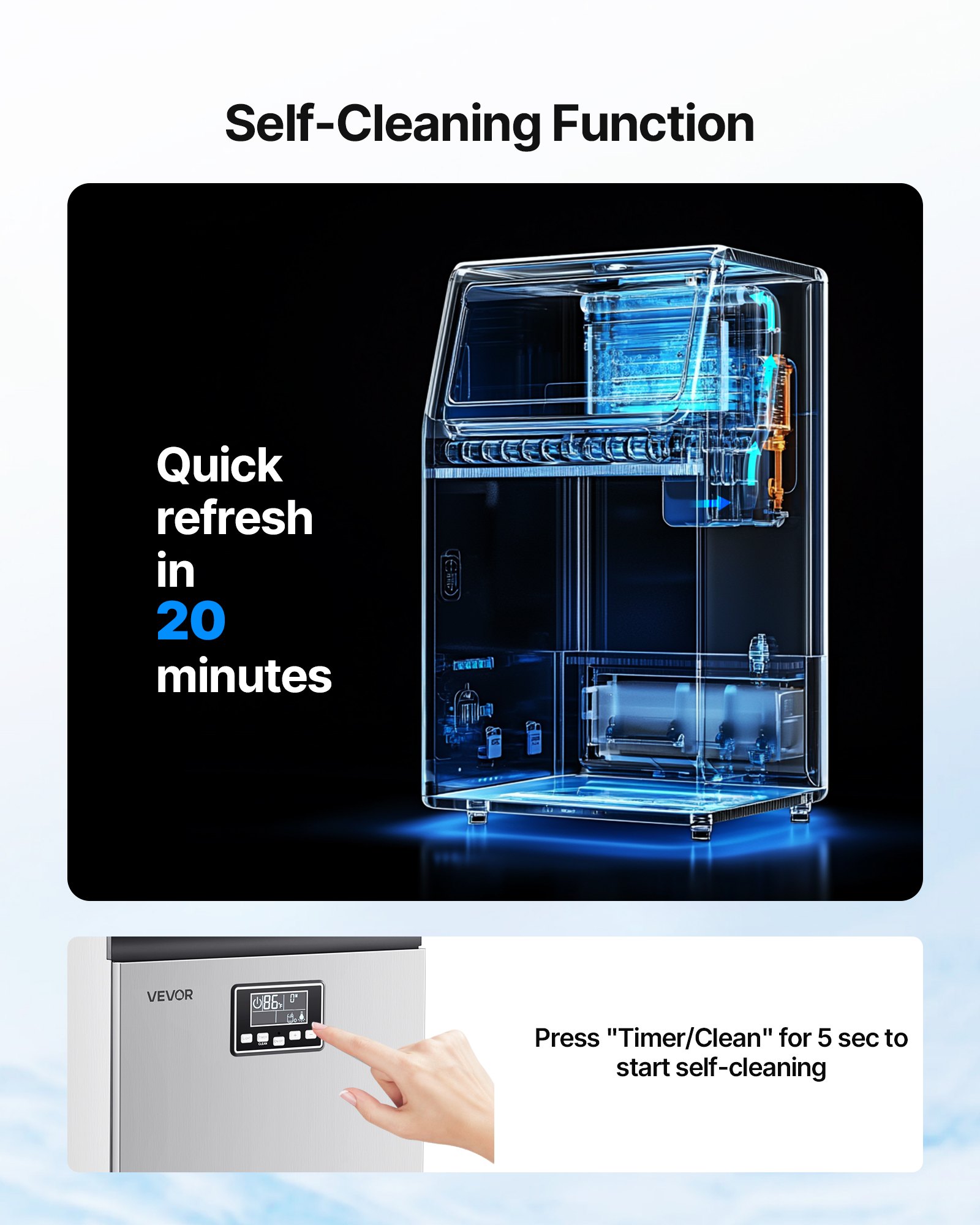 Easy to Clean: This self-cleaning ice maker runs a 20-minute automatic rinse cycle with a 3-second press of the “Mode” button. The patented removable water tray lets you lift and rinse for deep, thorough cleaning—inside and out
