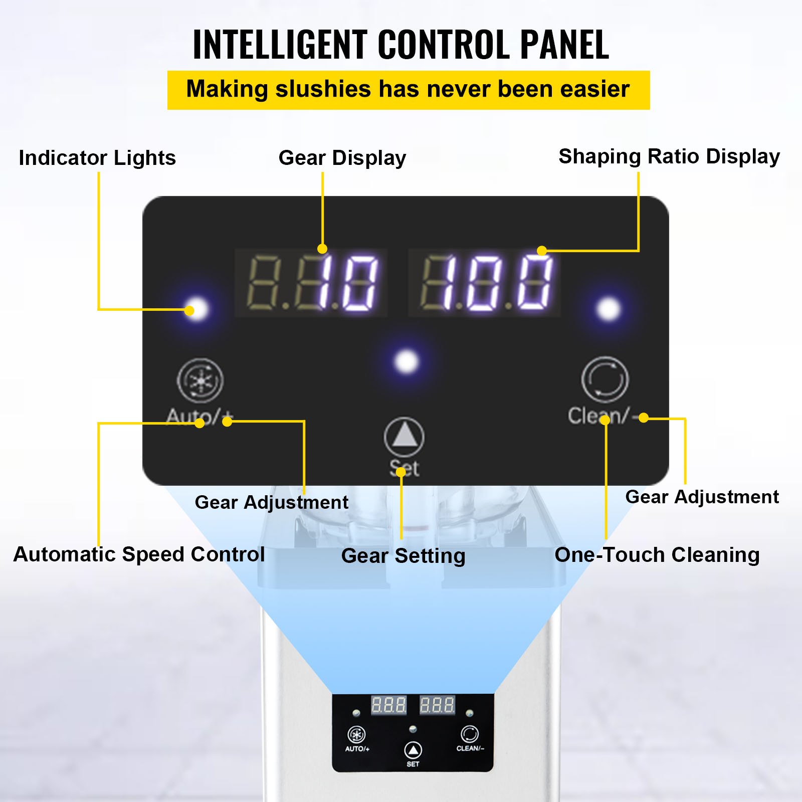 Precise Control Area: A brief control panel promises ease of use for the commercial slushie machine. With a simple one-touch operation, you will have your favorite frozen drink ready to slurp. Two digital displays make gear and shaping ratio status clear at a glance. The automatic cleaning mode is also available to save effort.