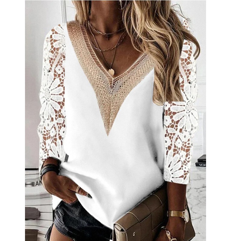 Commuter Nine-quarter Sleeve V-neck Stitching Hollow Lace Chiffon Shirt Pullover
