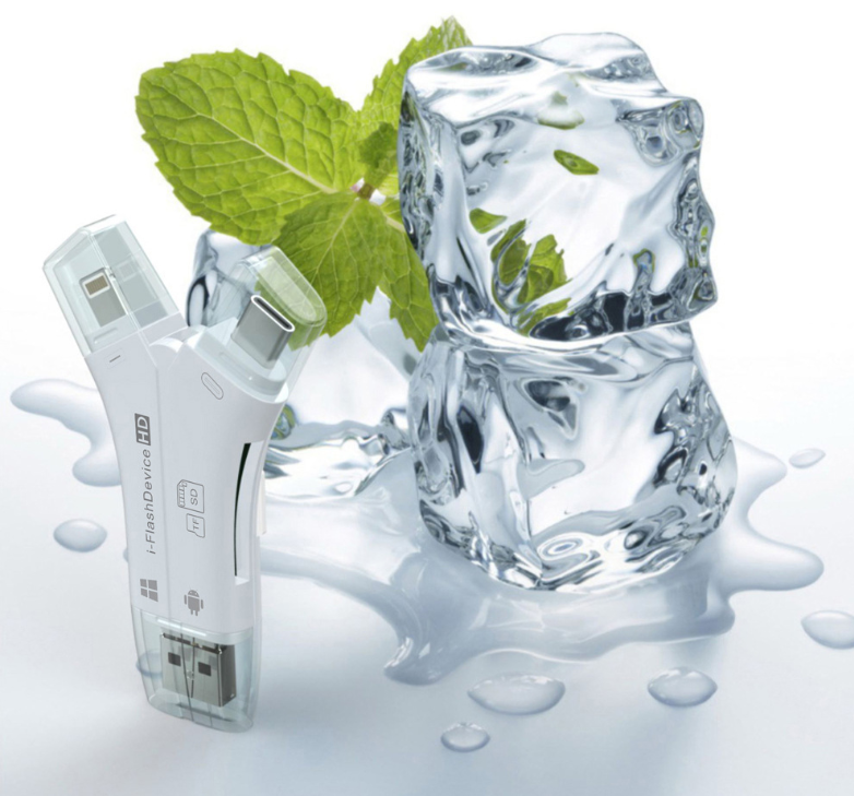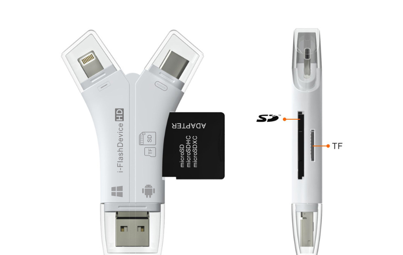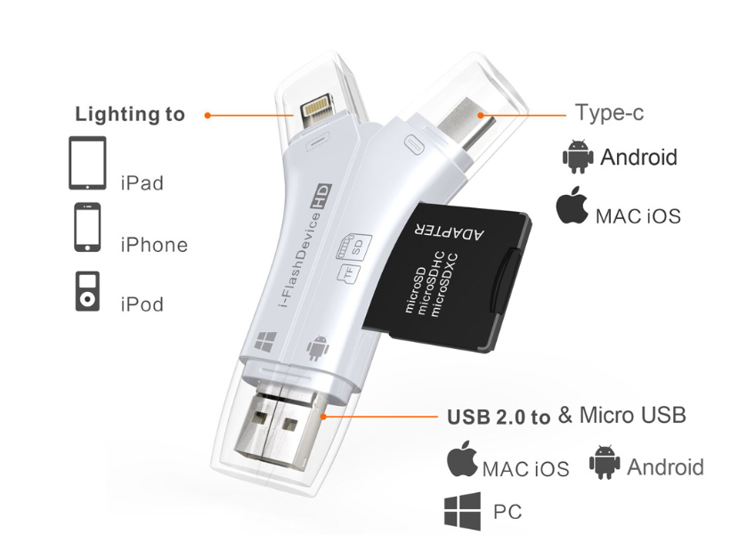 [I flash device 4-in-1 mobile phone card reader] is a card reader for Apple / Android / Computer / TYPE-C (Lightning / mirco / USB / TYPE-C) interfaces for all devices on all platforms, easy to implement External storage sharing, expanding the storage capacity of mobile devices, breaking the limit of mobile phone capacity, plug and play, storing your favorite photos, videos, movies and music into your mobile repository! Supports file encryption, protects privacy, rejects the high memory difference of Apple mobile phones, can directly take photos and videos and save them to TF / SD card, does not occupy mobile phone memory, convenient and practical, supports Apple 5 or more devices (iPhone5 / 5c / 5s / 6 / 6p / 6s / 6sp / 7 / 7p / 8 / 8p / X, iPad4 / 5 / mini2 / mini3 / mini4 / Air / Pro, iPod touch5 / touch6) and all Android devices with OTG function.