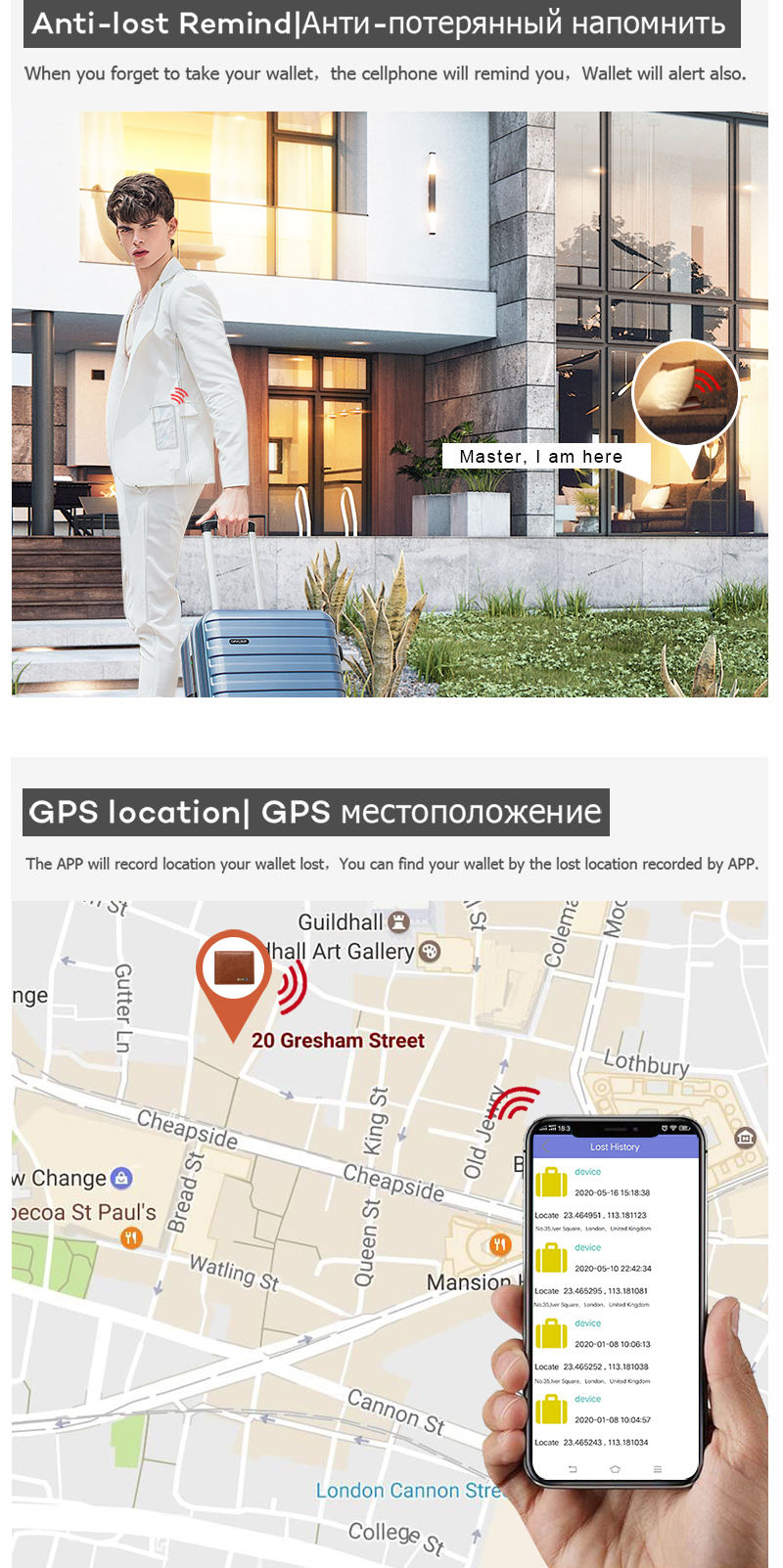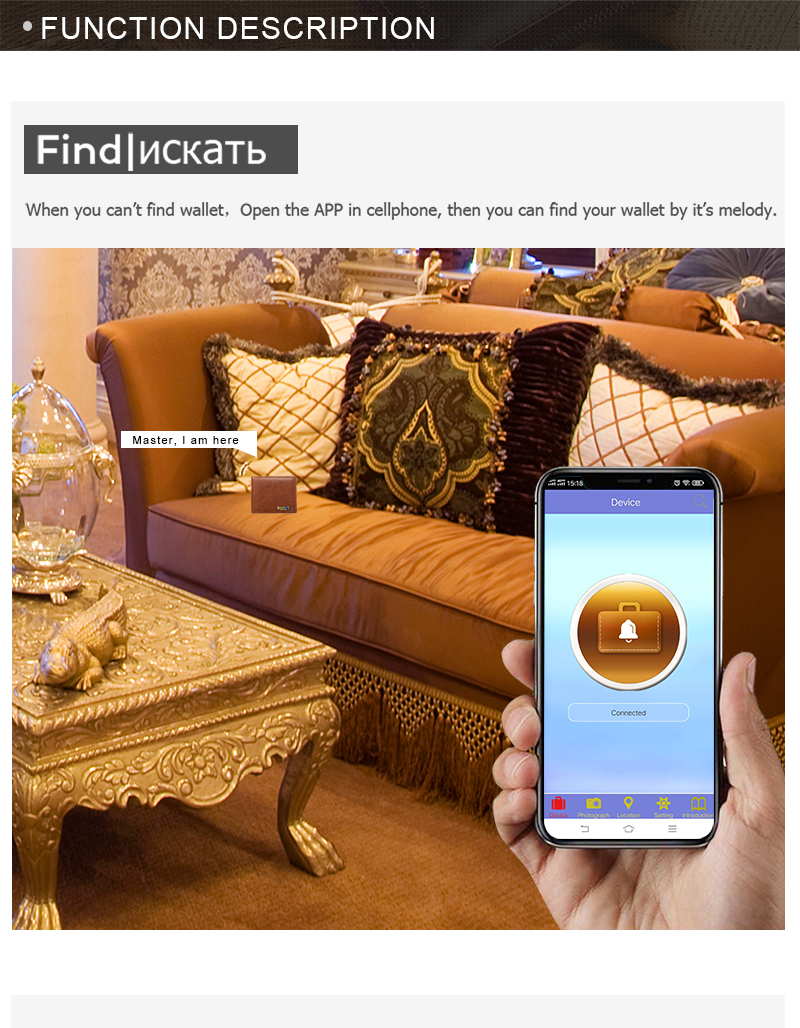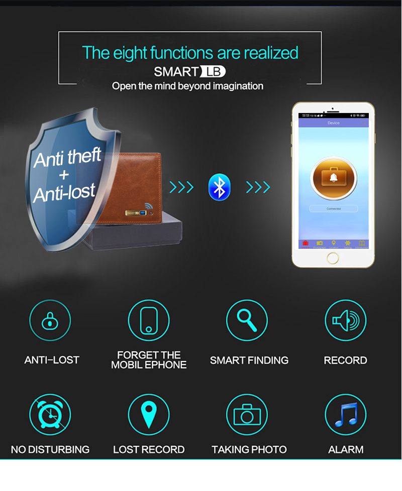 2. The smart wallet can be connected with the cellphone via bluetooth, and has the functions of anti-theft, anti-lost and positioning.