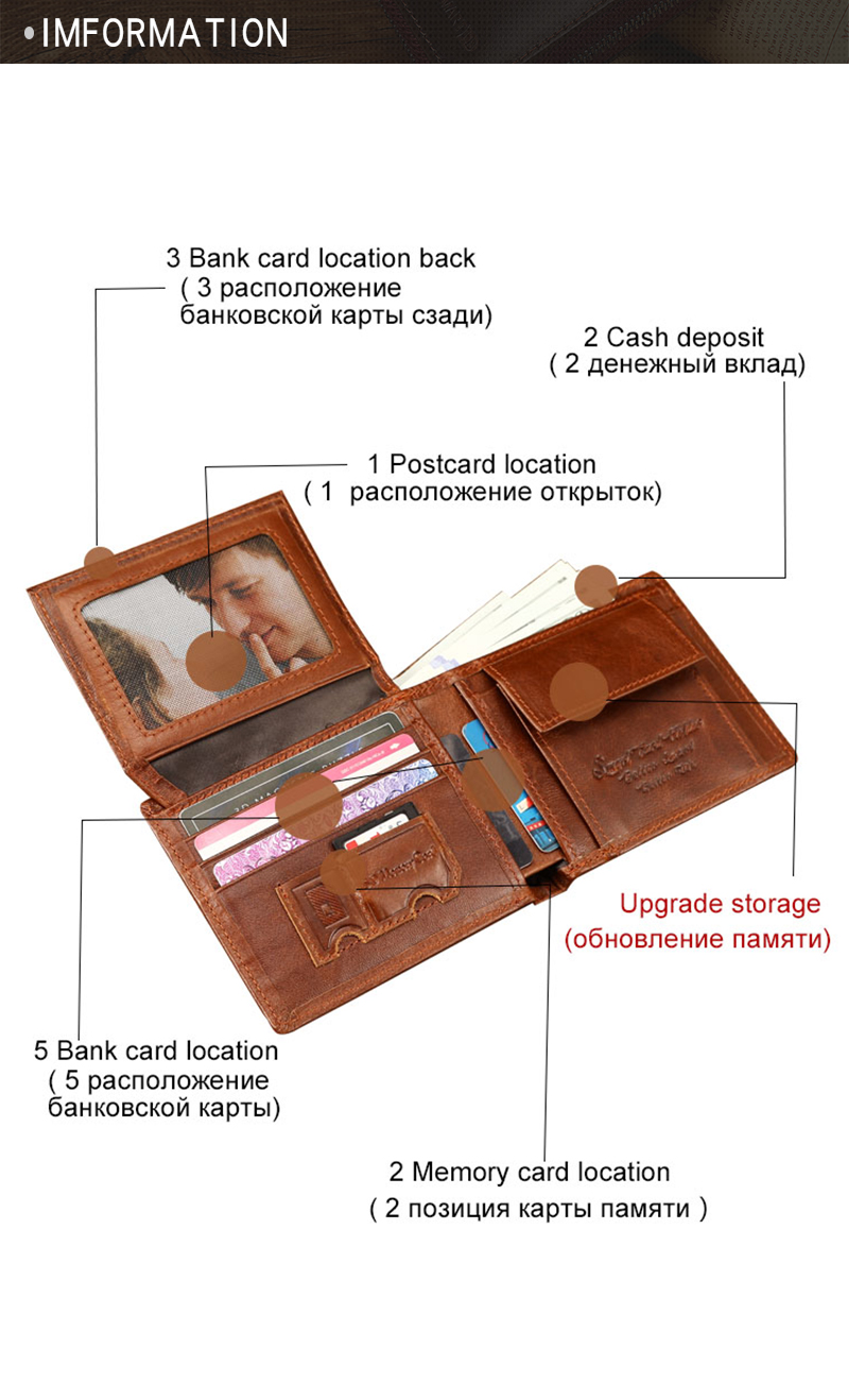 The internal structure of the packet: concealed compartment, bill holder, photo slot, change slot, certificate slot, card slot, check slot