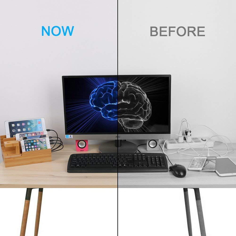- Keeps for your cell phones, tablets, or other USB charging devices organized neatly on your desktop or counter. - Made of natural bamboo material with beautiful, elegant, durable design, crafted from bamboo also for fresh looking and less environmental impact. - It helps you to put your cables and devices together without any tangles or mess. - Whether at your home or at your office, special design provides you a tidy charging stand, hide the long redundant cables. - This charging station is designed to accommodate all of your electronic devices - for Apple Watch, iPhone, iPad Universal Smart Phone and Tablet.