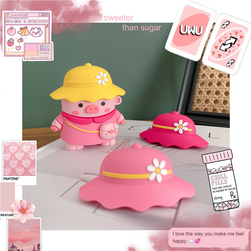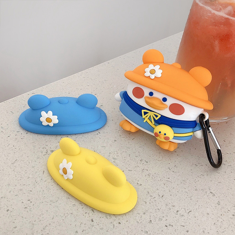 Color: A:backpack duck + three hats, B:backpack piggy + three hats