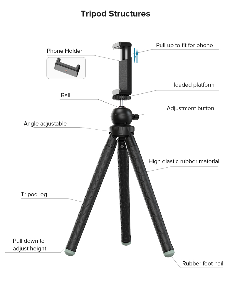 4. Hidden rotary tripod lock, firm buckle lock, round head rubber nails, strong grip, stable anti-skid.