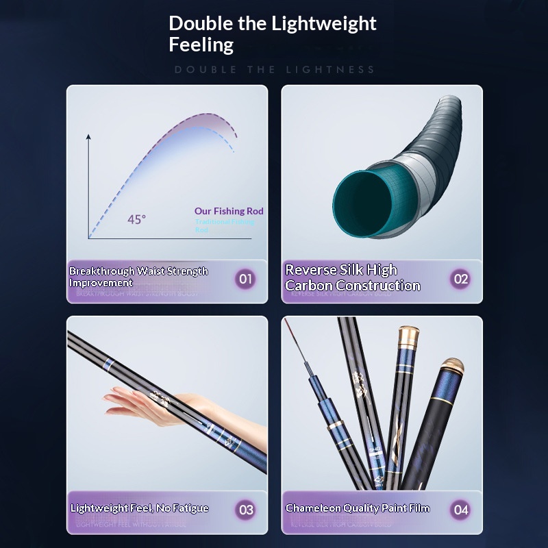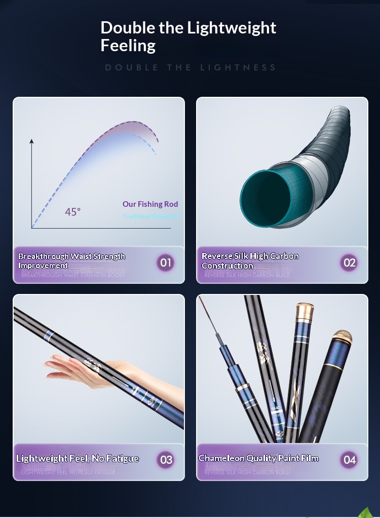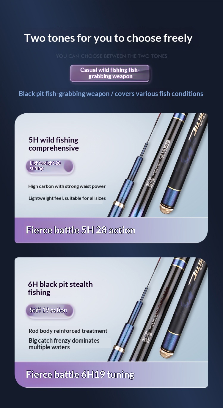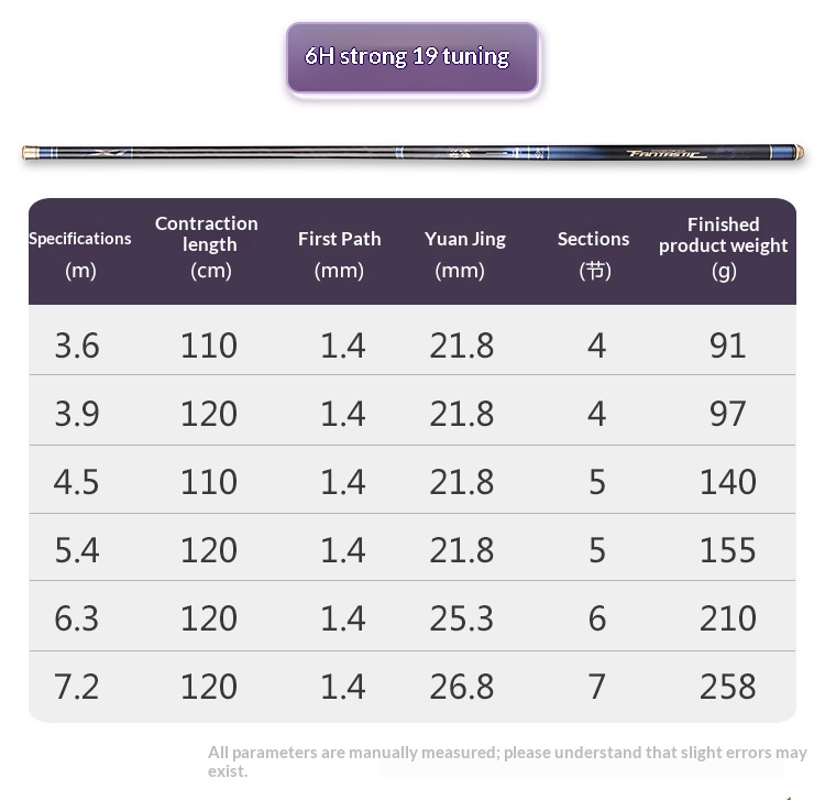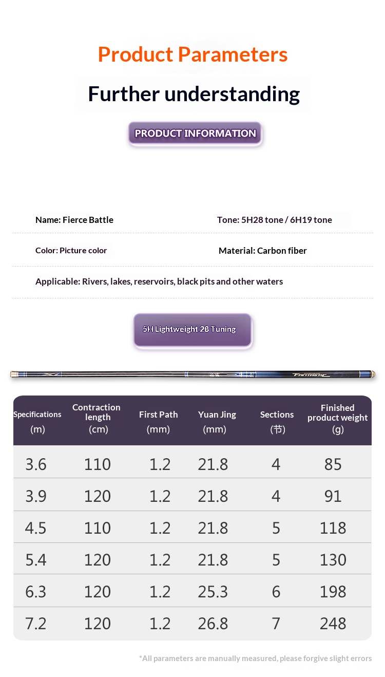 Length: 3.6 m [5H version] — lightweight feel [28 action]; 3.9 m [5H version] — lightweight feel [28 action]; 4.5 m [5H version] — lightweight feel [28 action]; 5.4 m [5H version] — lightweight feel [28 action]; 6.3 m [5H version] — lightweight feel [28 action]; 7.2 m [5H version] — lightweight feel [28 action]; 3.6 m [6H version] — strong pulling power [19 action]; 3.9 m [6H version] — strong pulling power [19 action]; 4.5 m [6H version] — strong pulling power [19 action]; 5.4 m [6H version] — strong pulling power [19 action]; 6.3 m [6H version] — strong pulling power [19 action]; 7.2 m [6H version] — strong pulling power [19 action]
