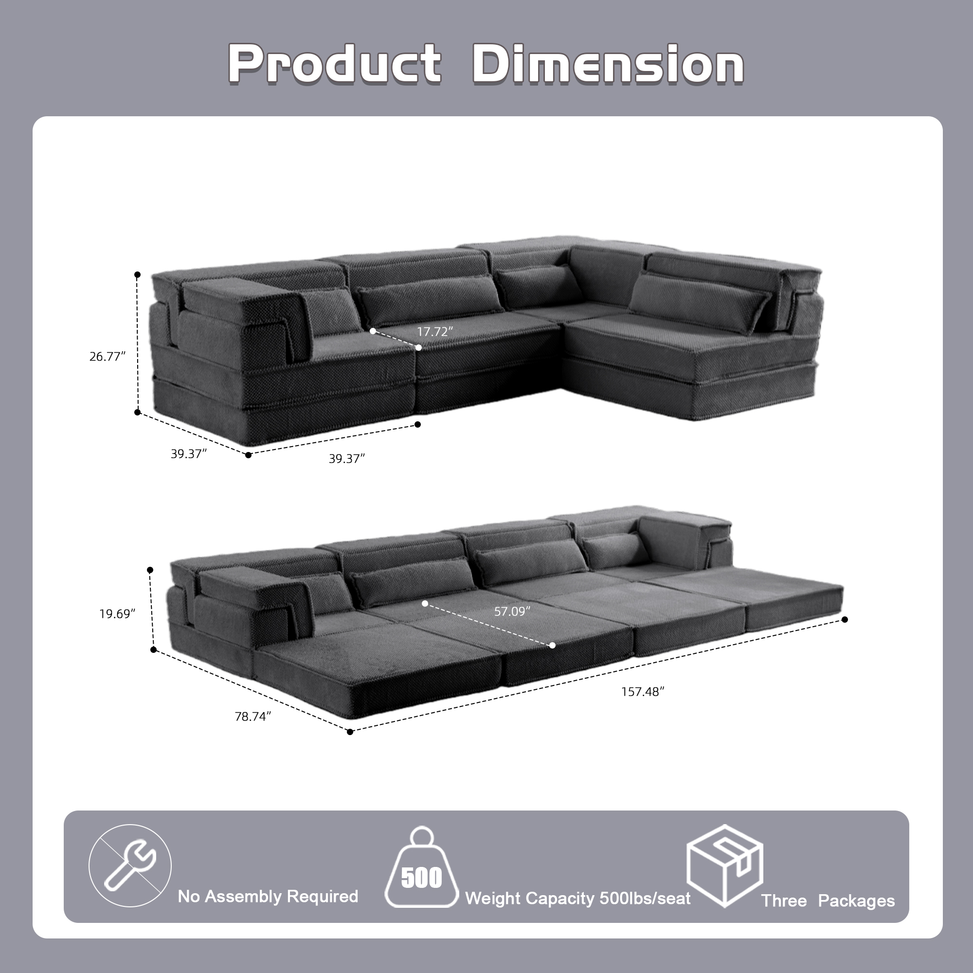 Product Name:Compression Mahjong Sofa,Convertible Floor Sofa Bed,DIY Boneless Modular Sectional Sofa,No Assembly Required,Circle fleece fabric,Oversized 4 Seater with 4 Pillows,Dark-grey