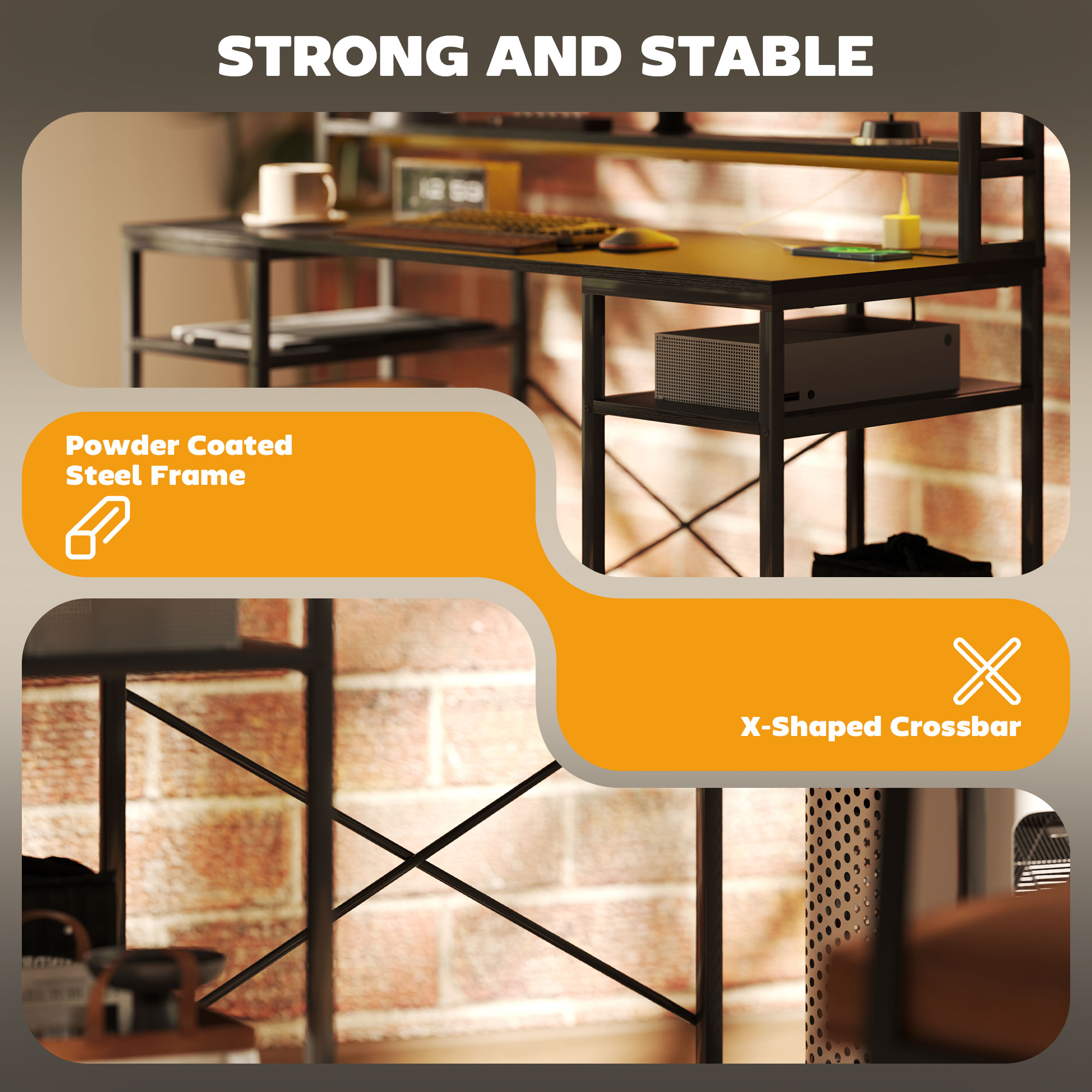 Transform your workspace with the computer desk with storage, designed for both style and functionality. It features a built-in charging station with two power outlets and two USB ports, keeping your devices powered up and organised. Customise the ambiance with RGB LED lights and enjoy the ergonomic monitor stand that promotes comfort with lots of storage options, including shelves and CPU stands. This writing desk helps you keep your home office or study area tidy and efficient.