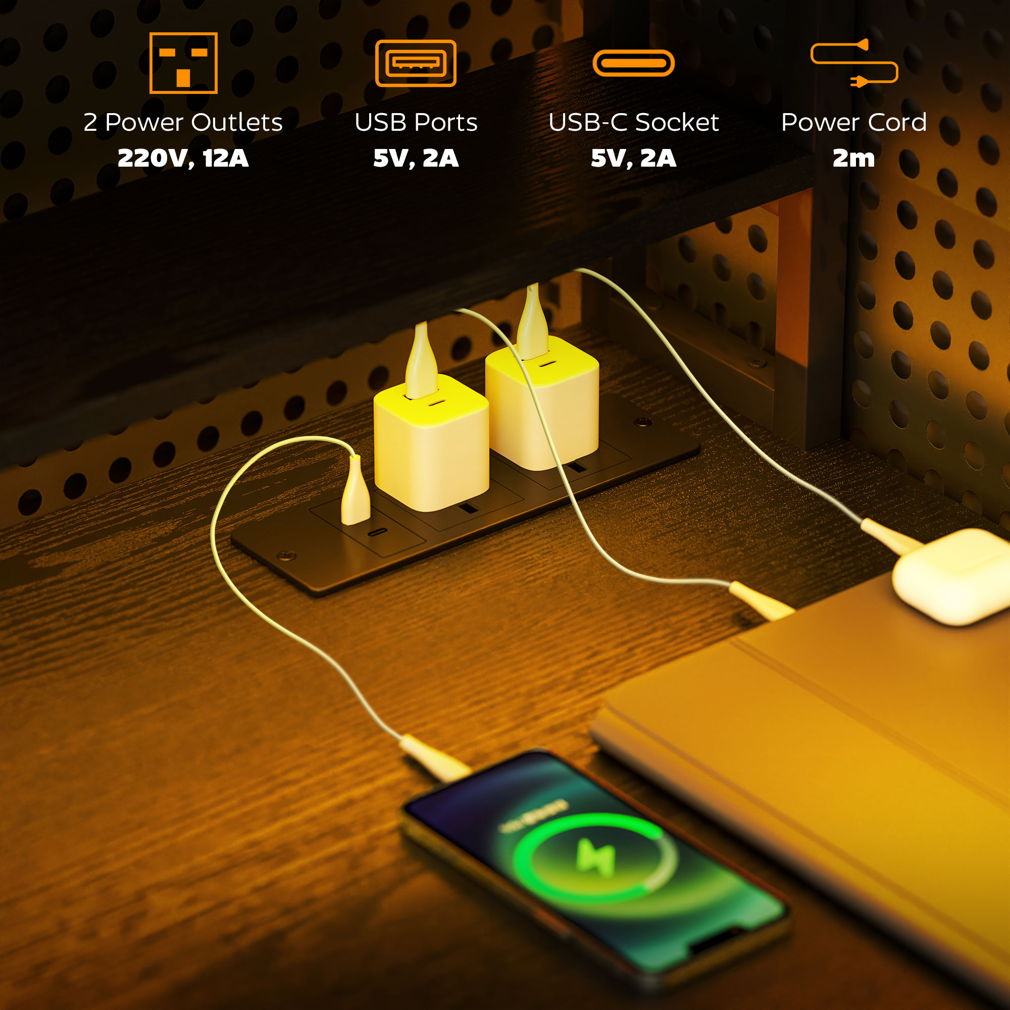 • Charging station includes two outlets and dual USB ports for convenience