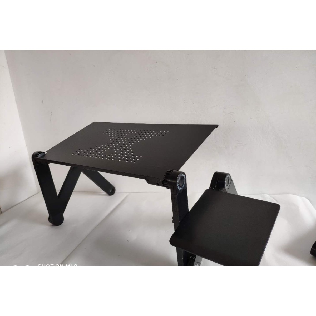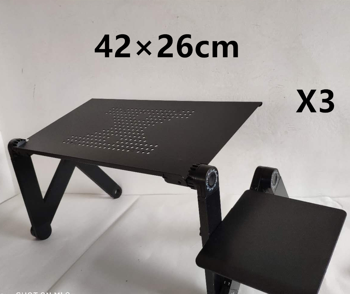 Flexible portable Laptop Notebook desk; Foldable in desk and legs, small in volume, easy to take, easy to use; Desk made of metal with a plastic mouse platform; Legs made of metal with plastic cores Ergonomic sleek design with multi-functional concept; The use of occasions: bed, sofa, table, carpet, meadow, desk, etc. Object: to adults, children, and all the crowd Two black non-slip baffles can prevent the computer sliding; Panel with ventilation holes helps the computer dissipate heat in time. Usage: computer desk, writing desk, Sketchpad,board, dining table,Flower Stand,etc. Made with strong ABS plastic and aluminum alloy achieve the high quality and compact design one. Each folding leg has 3 knobs which can adjust any height and angle you need. The 360°revolve provides the high flexibility just as human. High strength ABS plastic joint,combined with high-tech screen printing scale, convenient your adjustment.