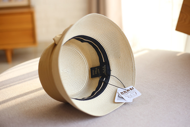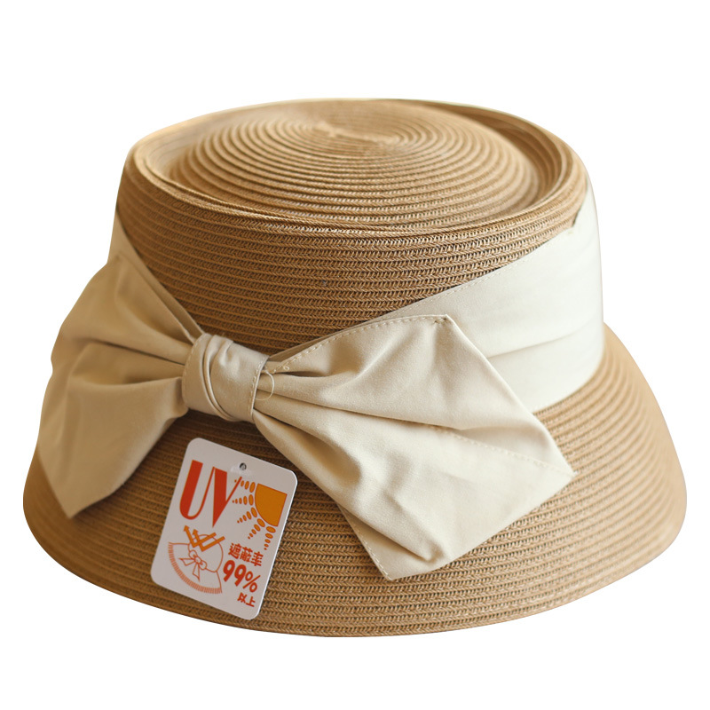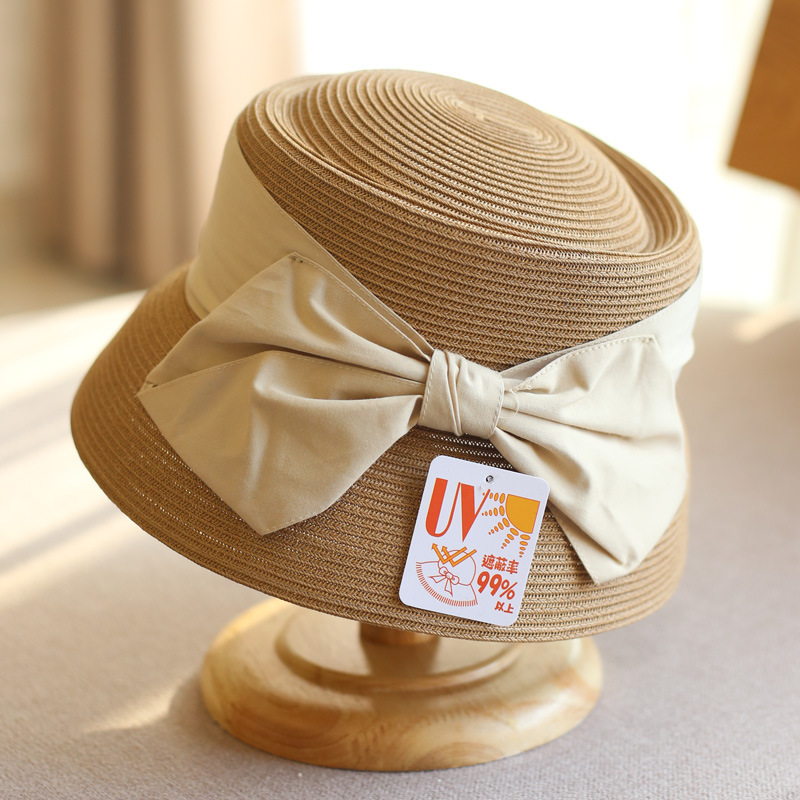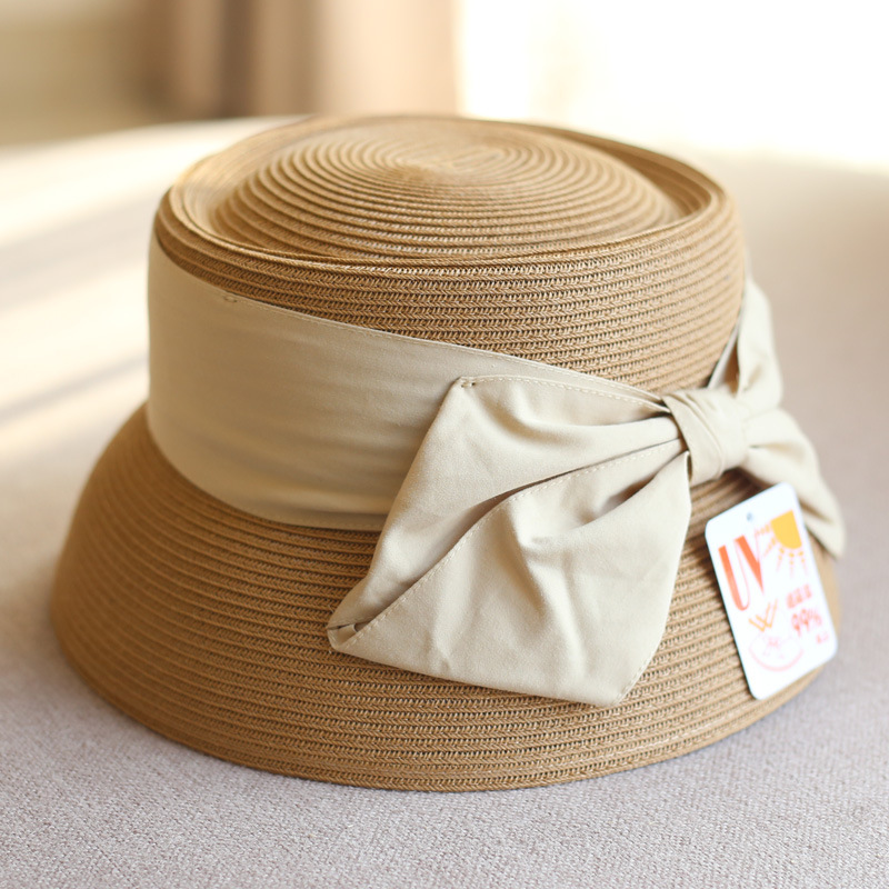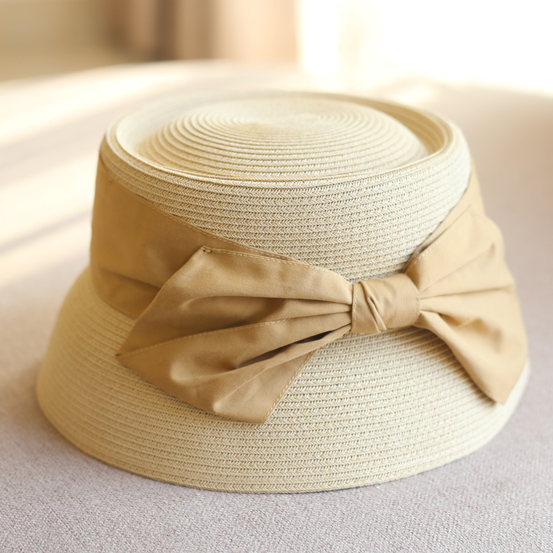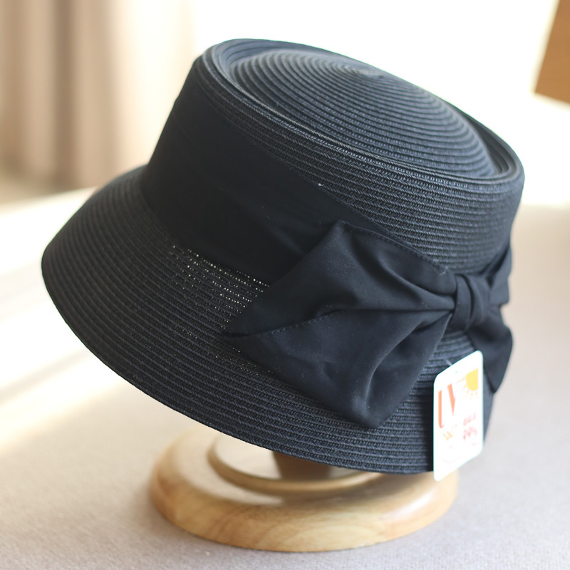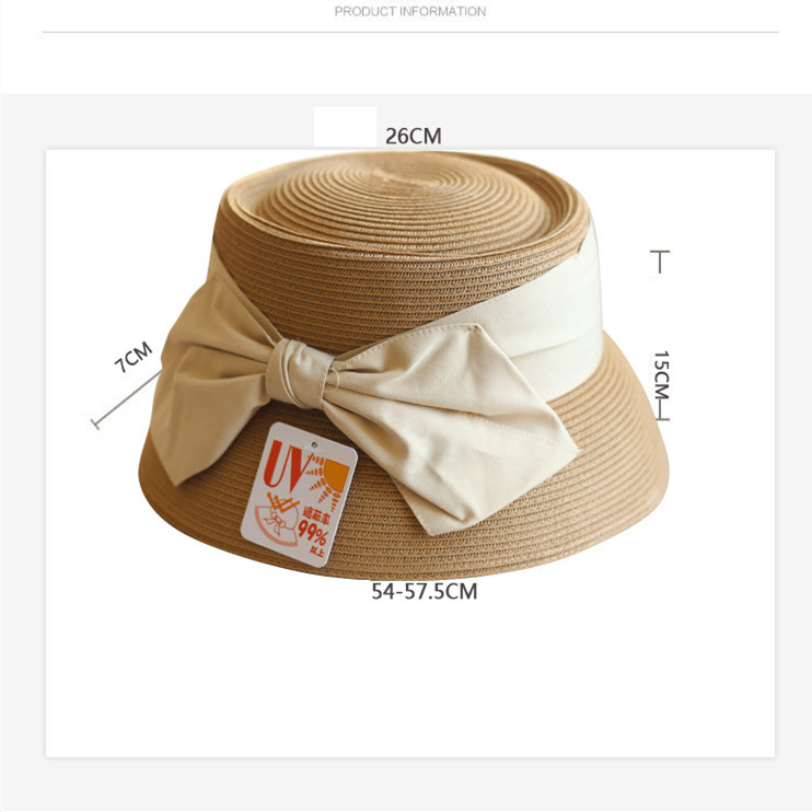 Concave Top Straw Woven Bucket Hat Cotton Bow