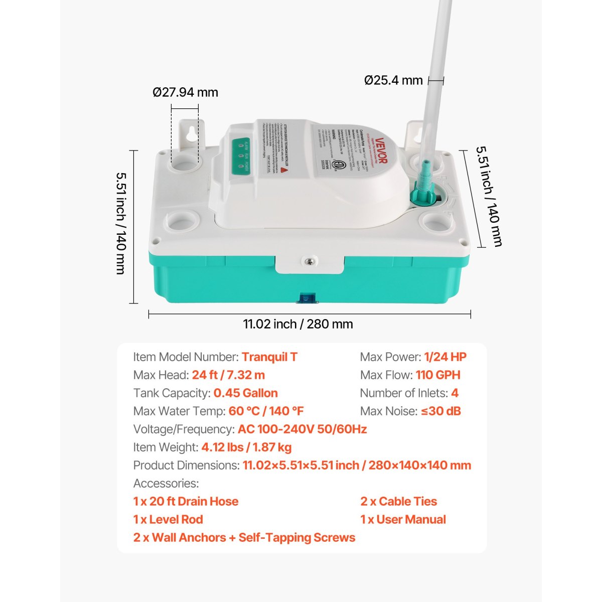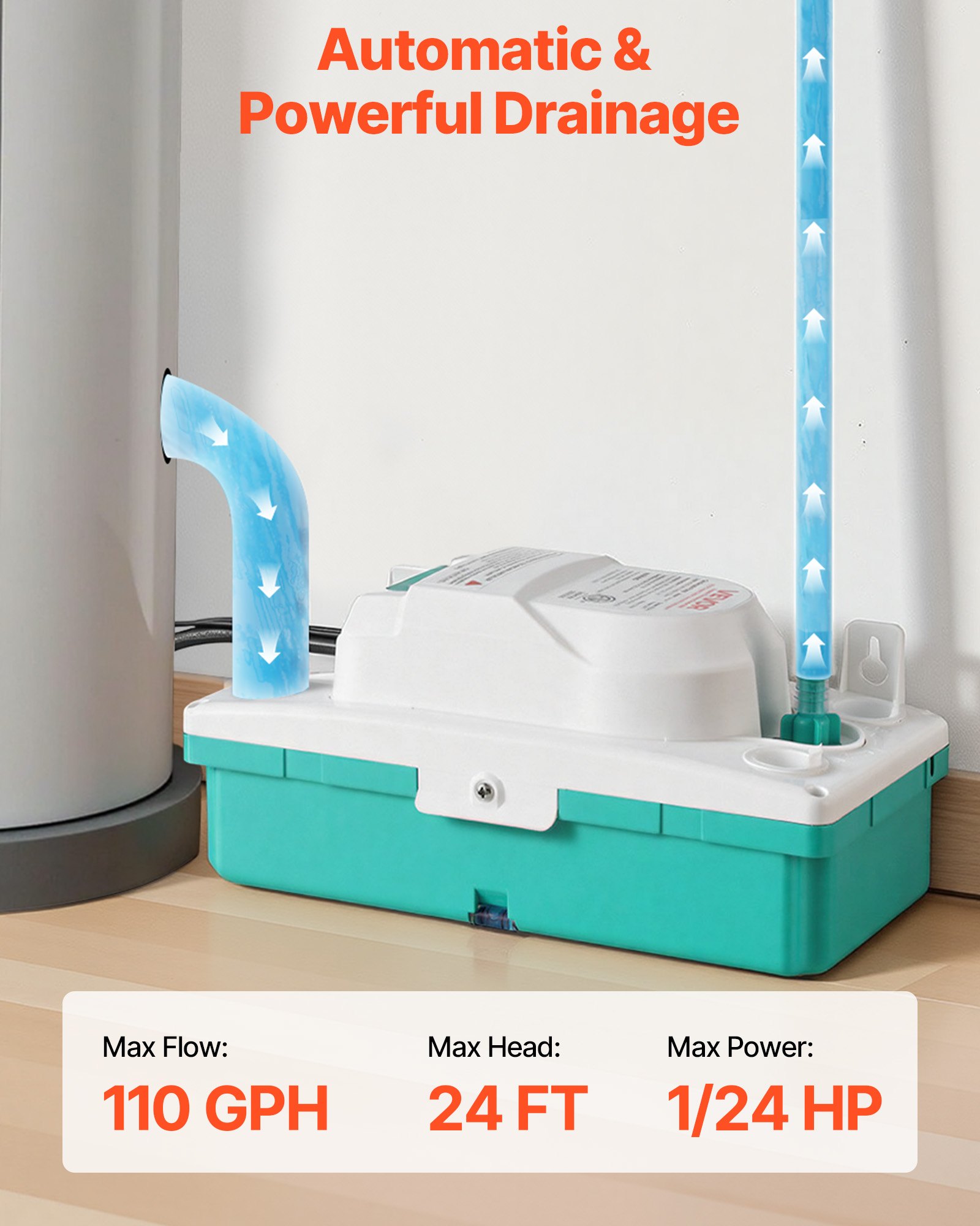Powerful Drainage: Delivers up to 110 GPH with a 24 ft lift, our condensate removal pump handles long-distance and uphill drainage with ease. The upgraded check valve with a non-return ball avoids backflow for steady operation when drains are far away