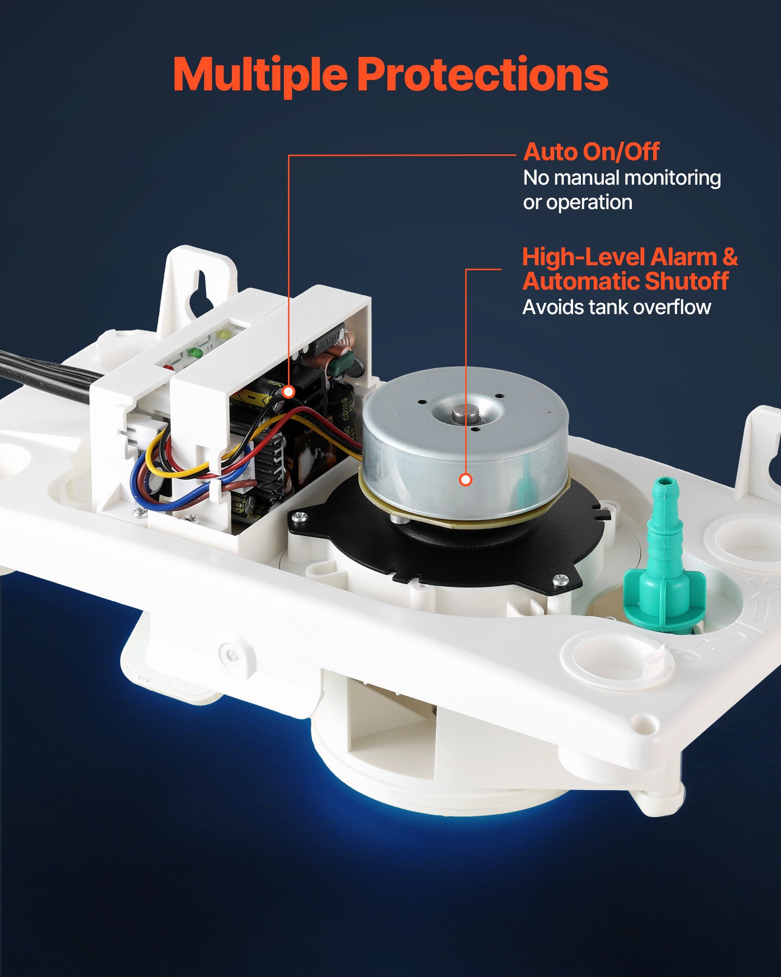 Multiple Protections: The condensate pump automatically starts and stops drainage, shuts off, and alerts when overloaded or blocked, safeguarding HVAC systems, furnaces, and dehumidifiers. Built-in overheat protection avoids dry running for long-term use