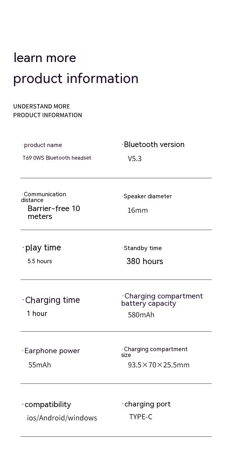 Main parameters: Product model: T69 earbuds Bluetooth earphones