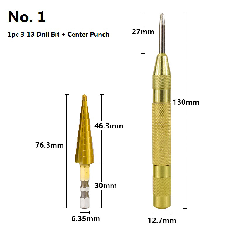 Model: 3-13 step drill + center punch, 4-32 step drill + center punch, small three pieces + center punch (3-12/4-12/4-20), straight groove large three pieces + center punch (4- 12/4-20/4-32), spiral groove large three pieces + center punch (4-12/4-20/4-32), large three pieces + serrated drill 3pc