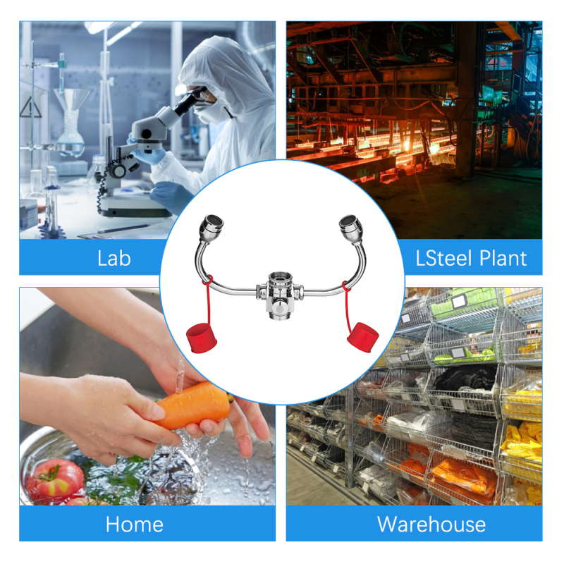 3. Adjustable design: ANSI standard, the nozzle can be rotated, and direction and water flow are adjustable. The 180-degree rotary switch can not only switch between hand washing, eye washing, and drinking water but also adjust the water flow