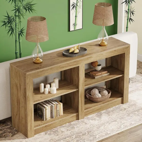 Rustic Elegance Console: This 59.1-inch console table combines sleek modern lines with a rustic wood finish, radiating warmth and vintage charm. Its lower shelves are divided into 4 identical sections, enhancing its unique shape and aesthetic appeal