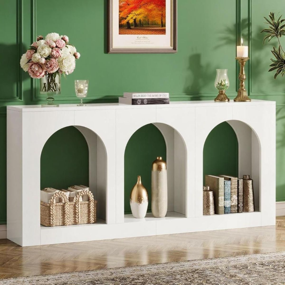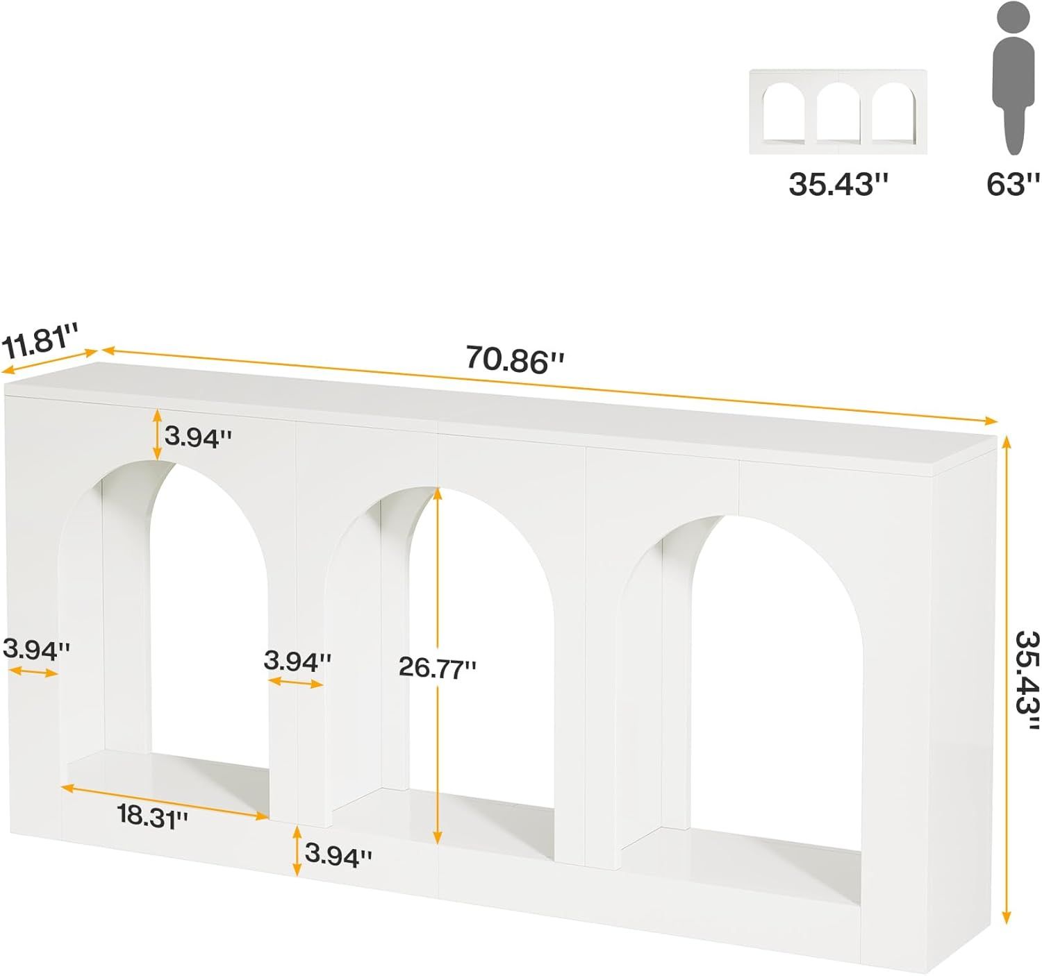 Spacious Storage Options: Measuring 70.9" W x 11.8" D x 35.4" H, with its three large arched shelves, this entryway table offers ample space to store and display. The open design allows for easy access and visibility, helping you keep your space organized