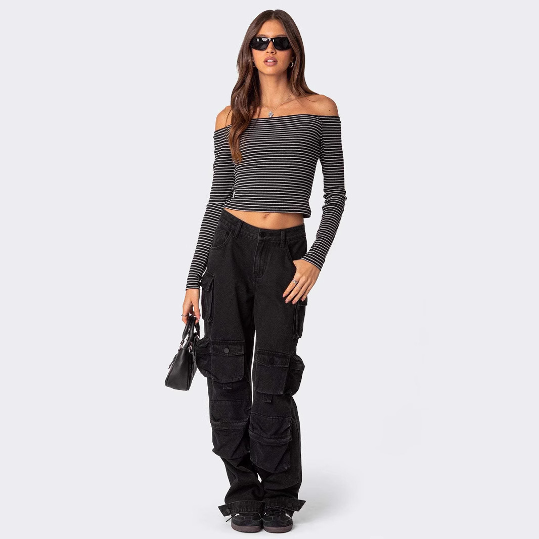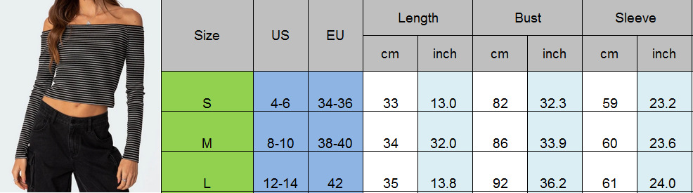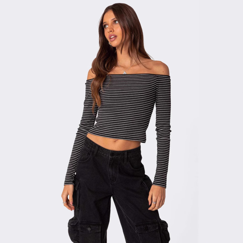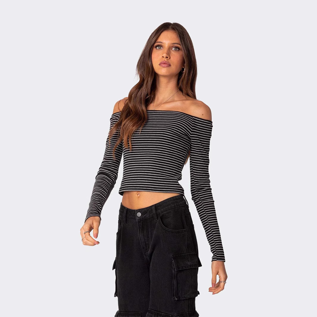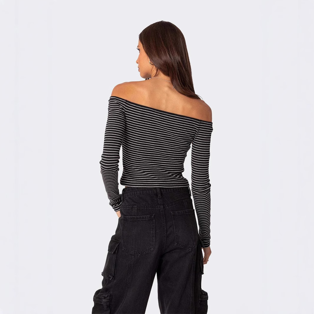 Contrast-color Striped Off-shoulder Long-sleeve Top For Women