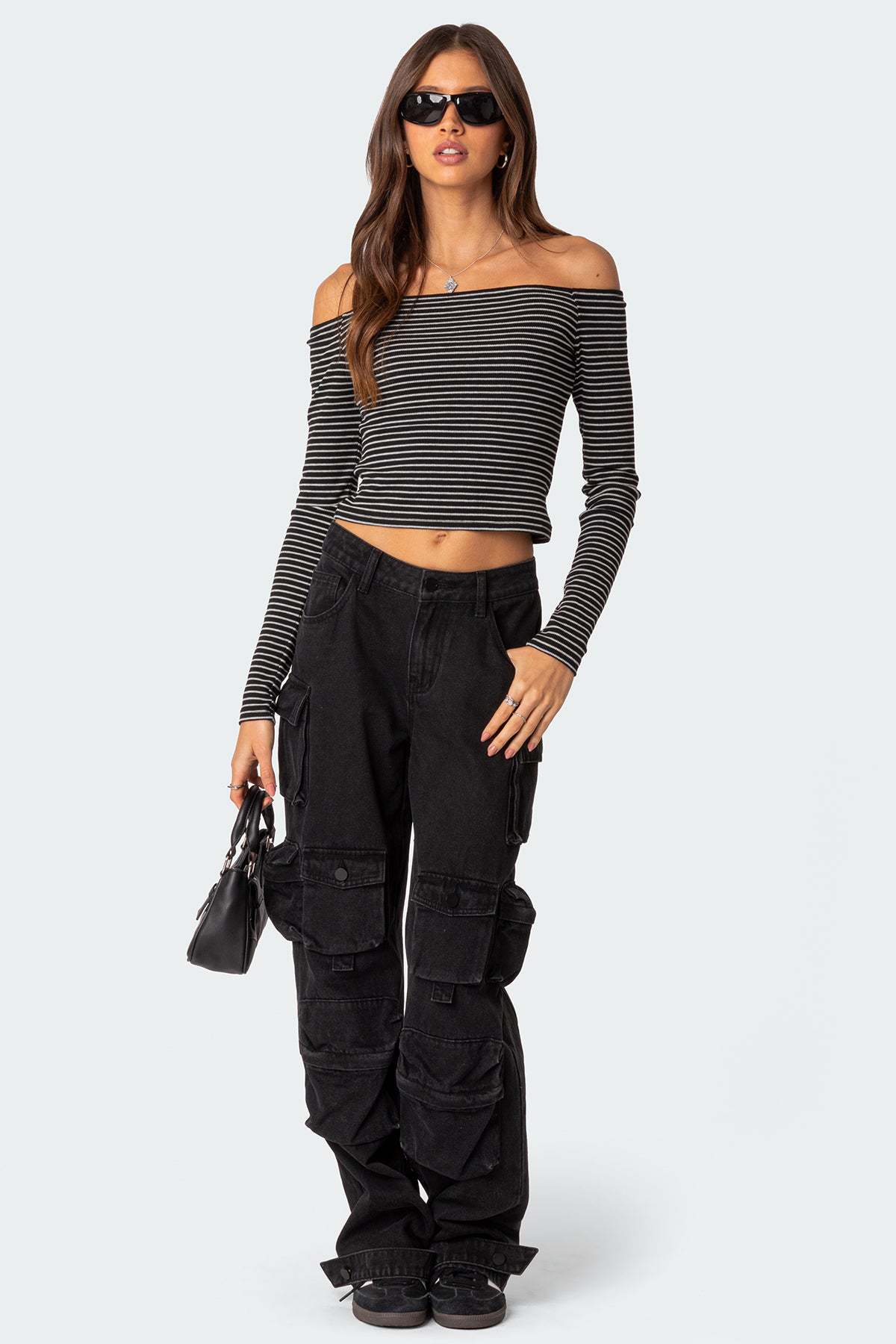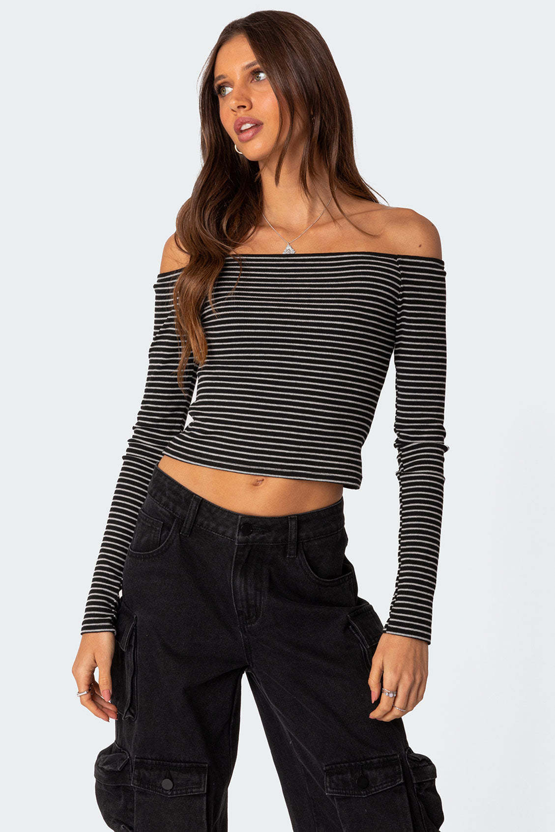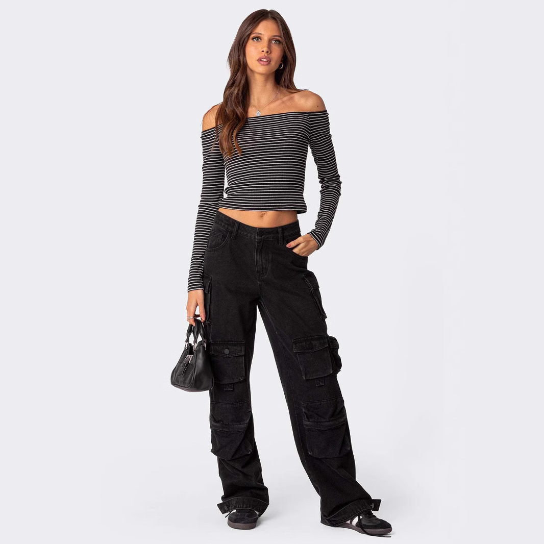 Contrast-color Striped Off-shoulder Long-sleeve Top For Women