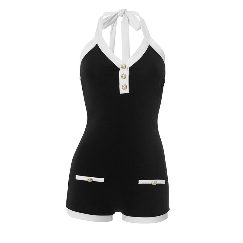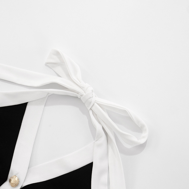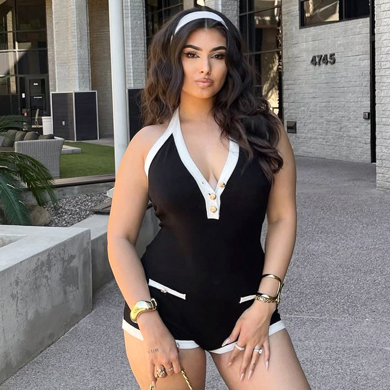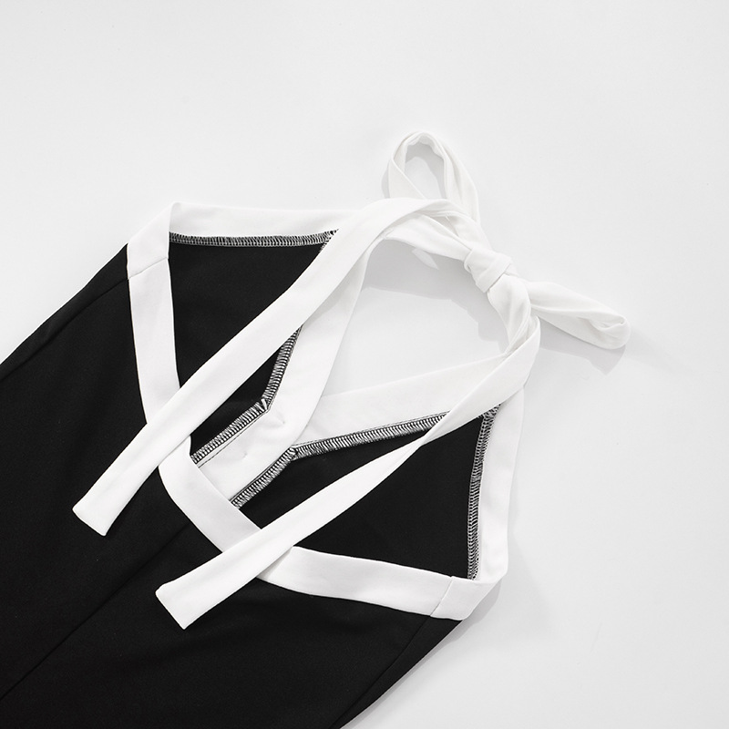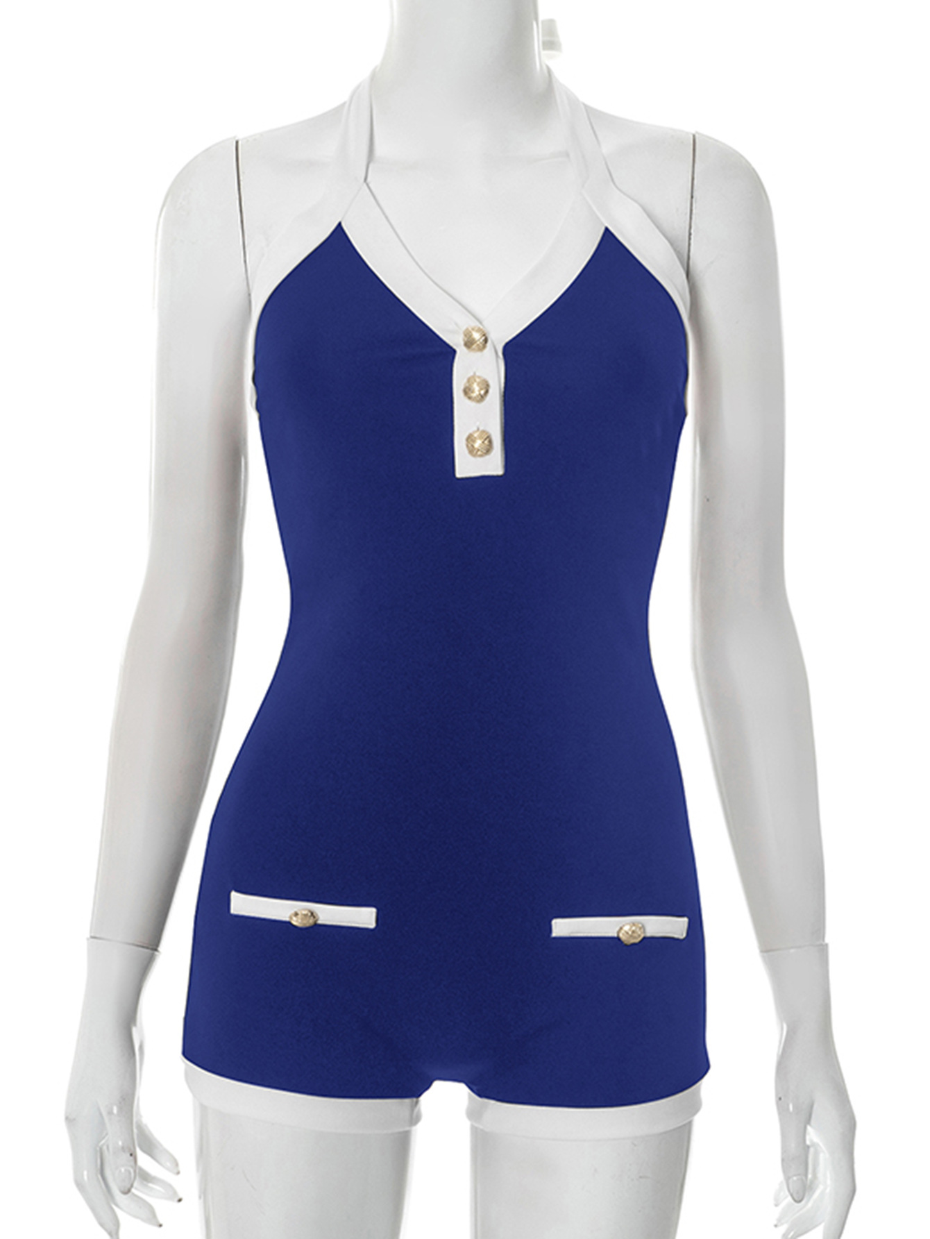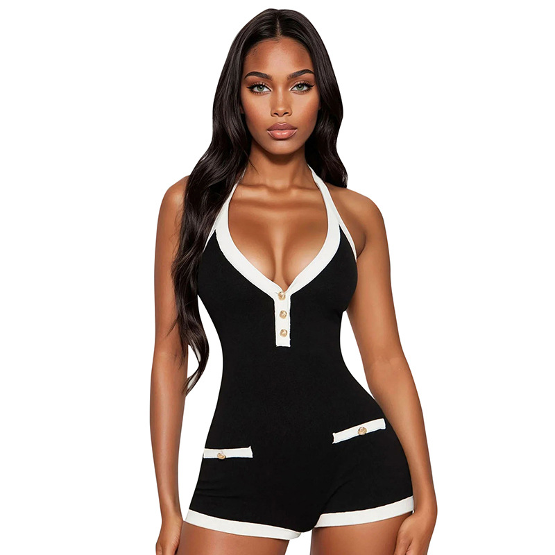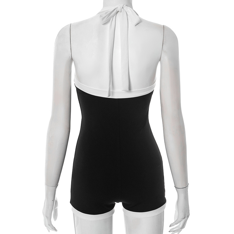 Contrast Color V-neck Halter Lace-up Backless Fastener Decoration Super Short Shorts Jumpsuit